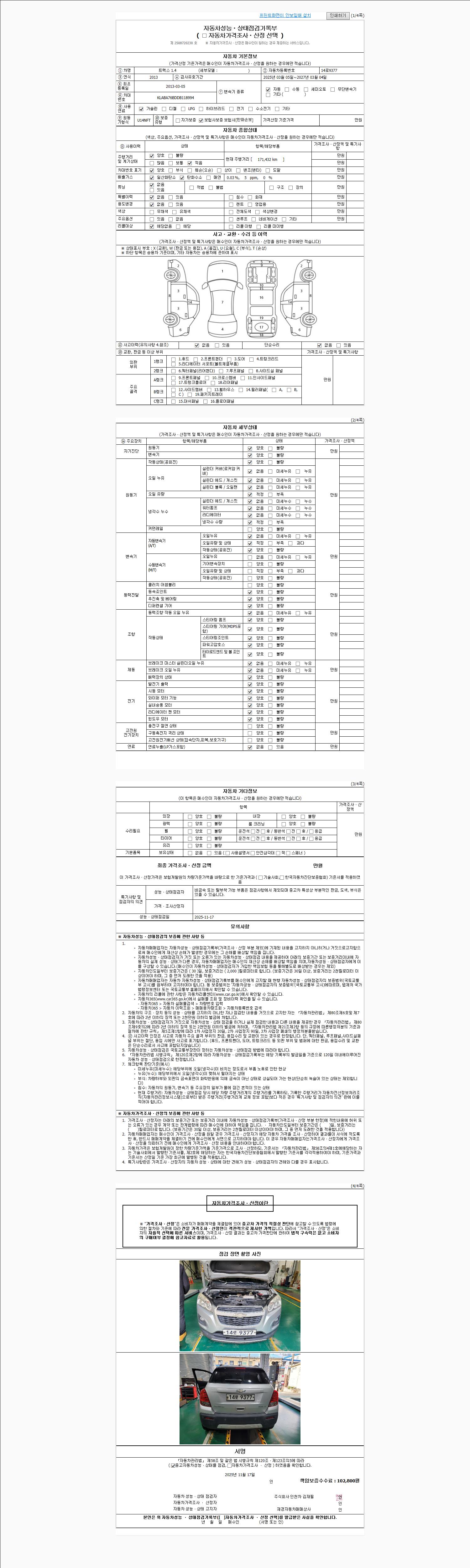 자동차관리법 시행규칙 제120조의 규정에 따라 별지 제 82호서식 《중고자동차 성능, 상태점검 기록부》를 발행한 성능, 상태점검자 및 매매자는 아래의 보증기간 또는 보증거리 이내의 중고자동차, 성능점검 기록부에 기재된 내용과 자동차의 실제 성능, 상태가 다른 경우 계약 또는 관계법령에 따라 매수인에 대하여 책임을 집니다.