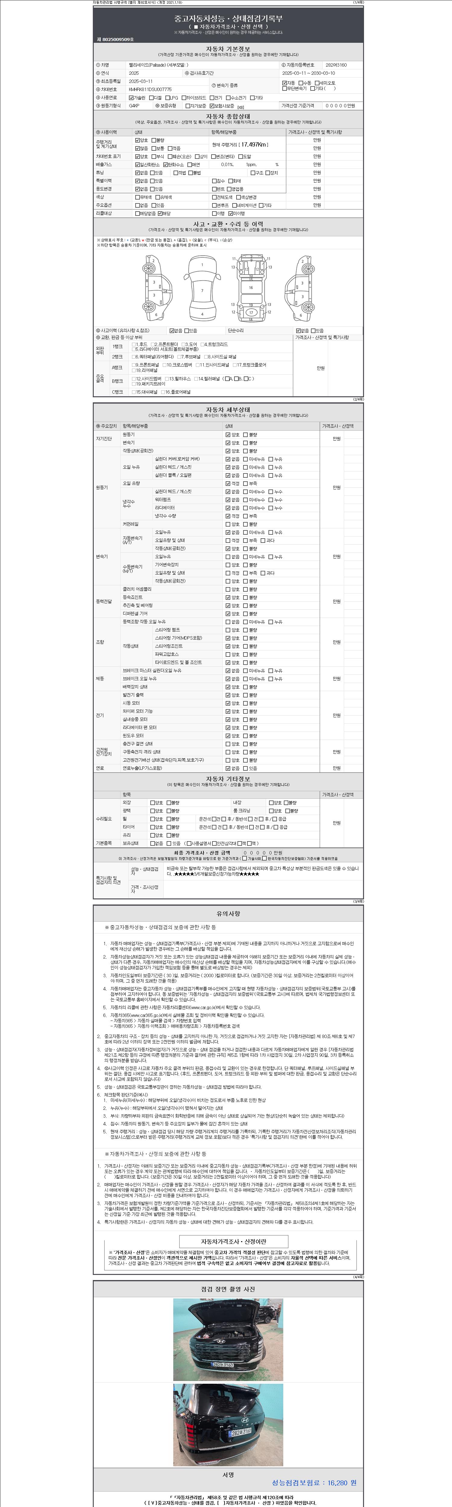 자동차관리법 시행규칙 제120조의 규정에 따라 별지 제 82호서식 《중고자동차 성능, 상태점검 기록부》를 발행한 성능, 상태점검자 및 매매자는 아래의 보증기간 또는 보증거리 이내의 중고자동차, 성능점검 기록부에 기재된 내용과 자동차의 실제 성능, 상태가 다른 경우 계약 또는 관계법령에 따라 매수인에 대하여 책임을 집니다.