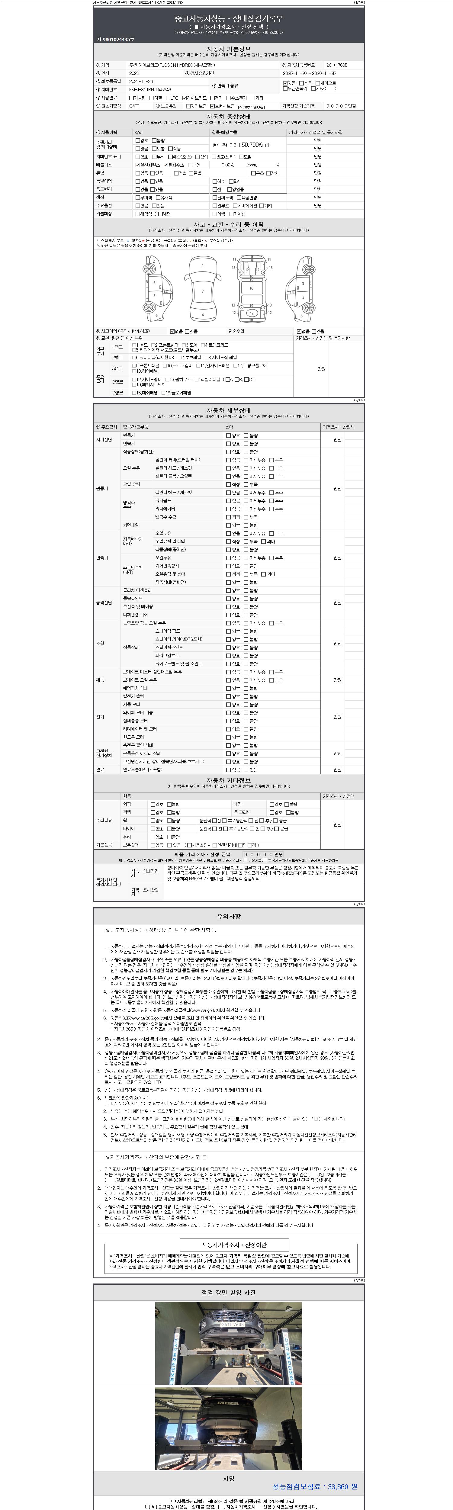 자동차관리법 시행규칙 제120조의 규정에 따라 별지 제 82호서식 《중고자동차 성능, 상태점검 기록부》를 발행한 성능, 상태점검자 및 매매자는 아래의 보증기간 또는 보증거리 이내의 중고자동차, 성능점검 기록부에 기재된 내용과 자동차의 실제 성능, 상태가 다른 경우 계약 또는 관계법령에 따라 매수인에 대하여 책임을 집니다.