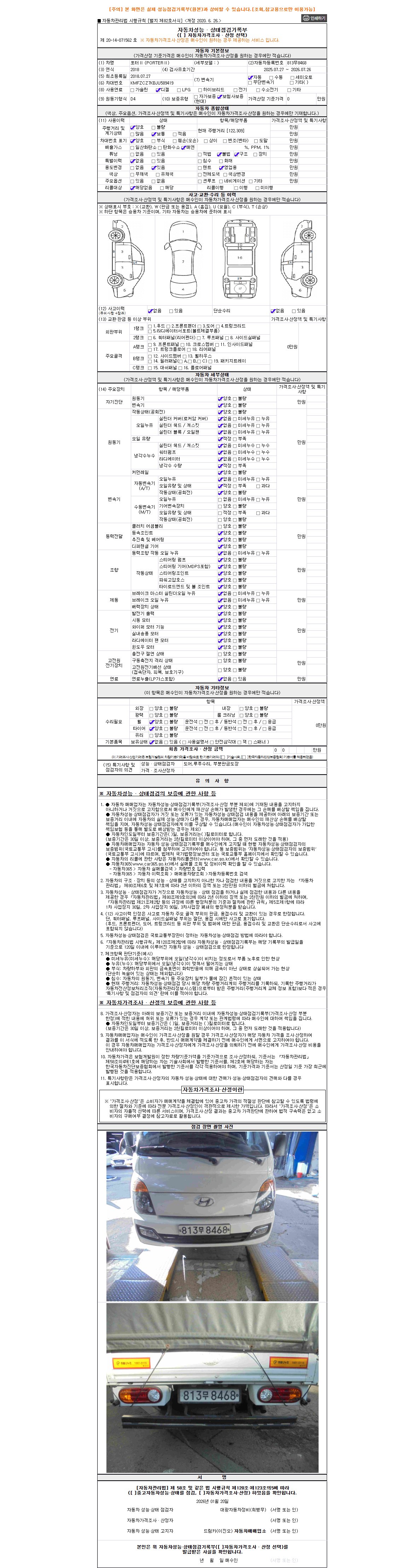 자동차관리법 시행규칙 제120조의 규정에 따라 별지 제 82호서식 《중고자동차 성능, 상태점검 기록부》를 발행한 성능, 상태점검자 및 매매자는 아래의 보증기간 또는 보증거리 이내의 중고자동차, 성능점검 기록부에 기재된 내용과 자동차의 실제 성능, 상태가 다른 경우 계약 또는 관계법령에 따라 매수인에 대하여 책임을 집니다.
