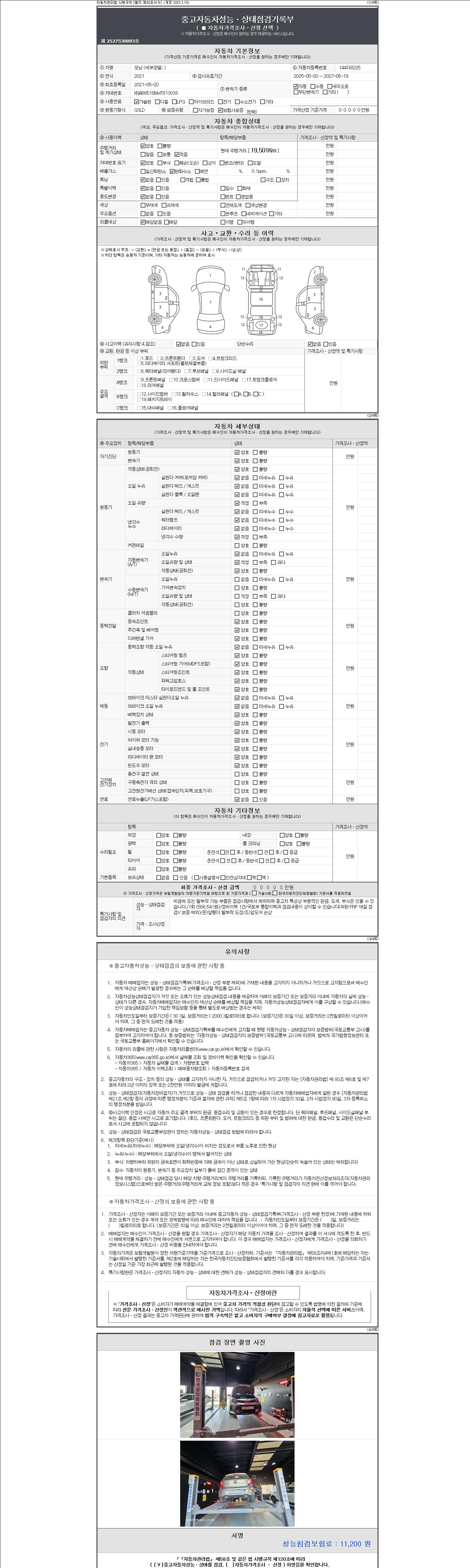 자동차관리법 시행규칙 제120조의 규정에 따라 별지 제 82호서식 《중고자동차 성능, 상태점검 기록부》를 발행한 성능, 상태점검자 및 매매자는 아래의 보증기간 또는 보증거리 이내의 중고자동차, 성능점검 기록부에 기재된 내용과 자동차의 실제 성능, 상태가 다른 경우 계약 또는 관계법령에 따라 매수인에 대하여 책임을 집니다.
