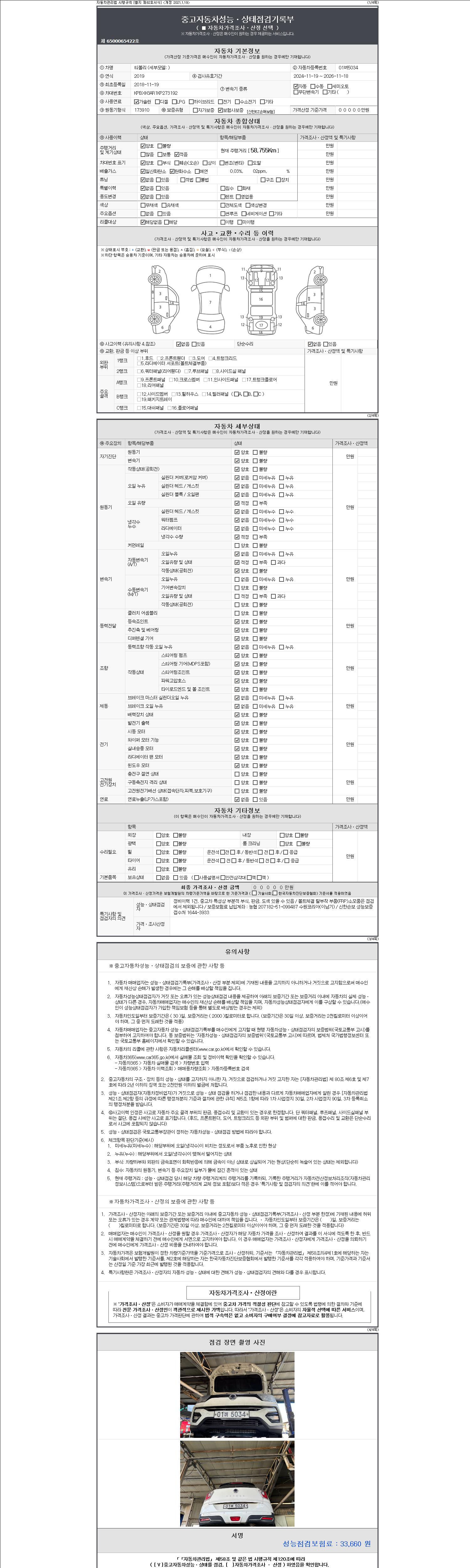 자동차관리법 시행규칙 제120조의 규정에 따라 별지 제 82호서식 《중고자동차 성능, 상태점검 기록부》를 발행한 성능, 상태점검자 및 매매자는 아래의 보증기간 또는 보증거리 이내의 중고자동차, 성능점검 기록부에 기재된 내용과 자동차의 실제 성능, 상태가 다른 경우 계약 또는 관계법령에 따라 매수인에 대하여 책임을 집니다.