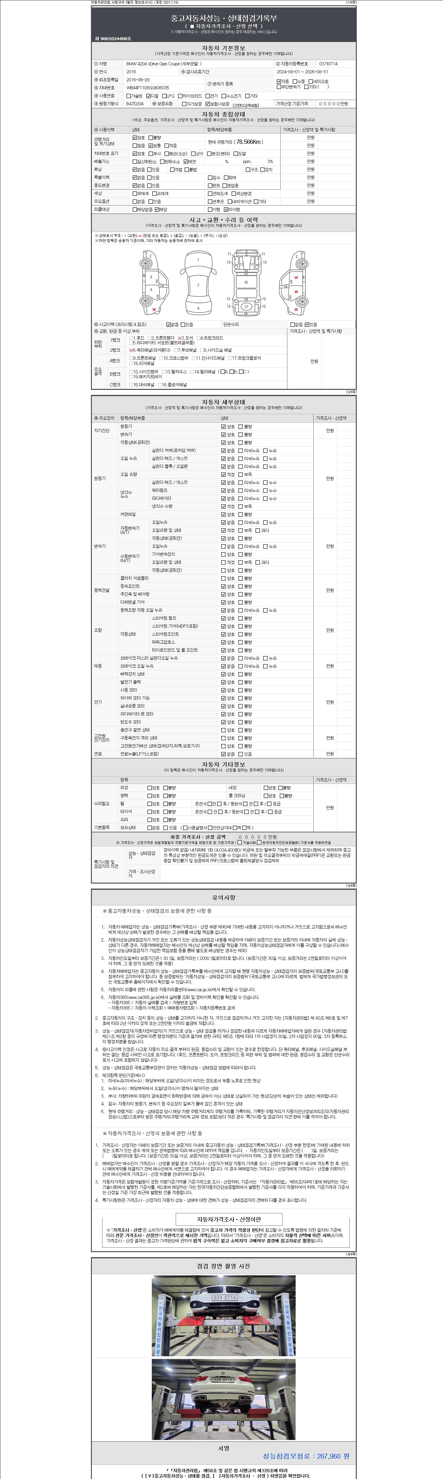 -중고자동차 매매업자를 통해 차량을 구입하실 경우 반드시 "중고자동차 성능, 상태점검 기록부"를 교뷰 받으셔야 하며, 매매업자는 반드시 의무 교부 하여야 압니다.