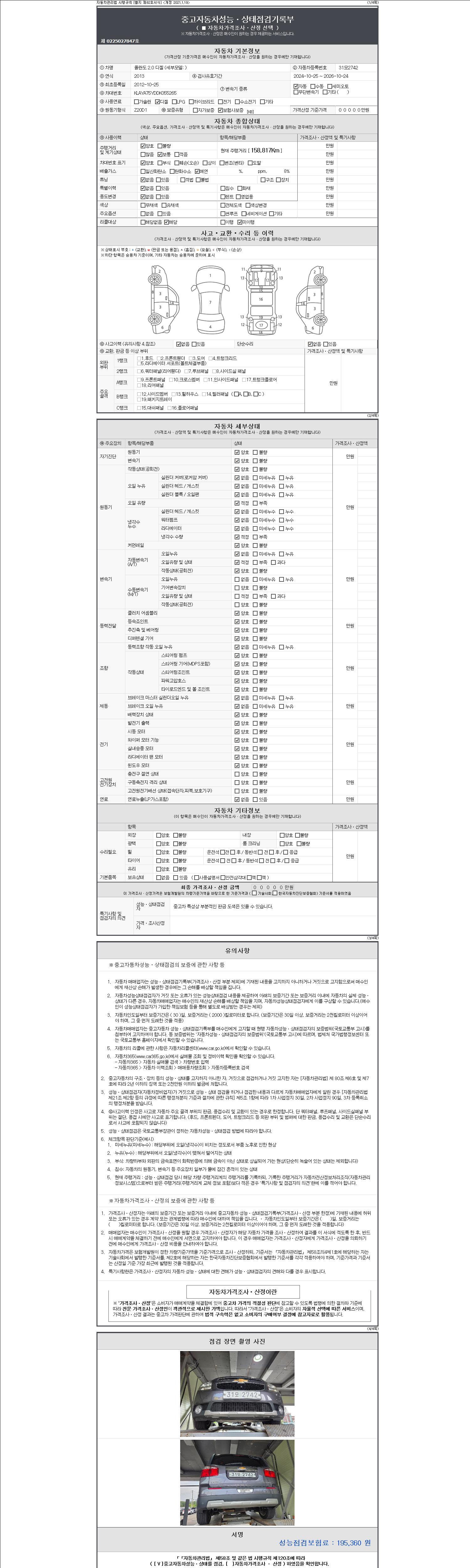 -중고자동차 매매업자를 통해 차량을 구입하실 경우 반드시 "중고자동차 성능, 상태점검 기록부"를 교뷰 받으셔야 하며, 매매업자는 반드시 의무 교부 하여야 압니다.
