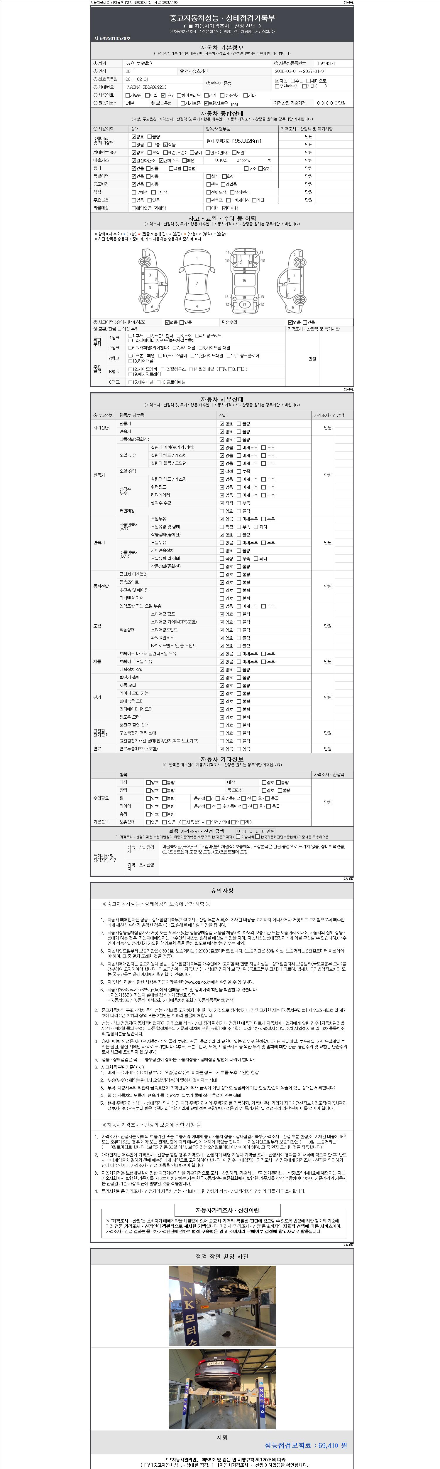 자동차관리법 시행규칙 제120조의 규정에 따라 별지 제 82호서식 《중고자동차 성능, 상태점검 기록부》를 발행한 성능, 상태점검자 및 매매자는 아래의 보증기간 또는 보증거리 이내의 중고자동차, 성능점검 기록부에 기재된 내용과 자동차의 실제 성능, 상태가 다른 경우 계약 또는 관계법령에 따라 매수인에 대하여 책임을 집니다.