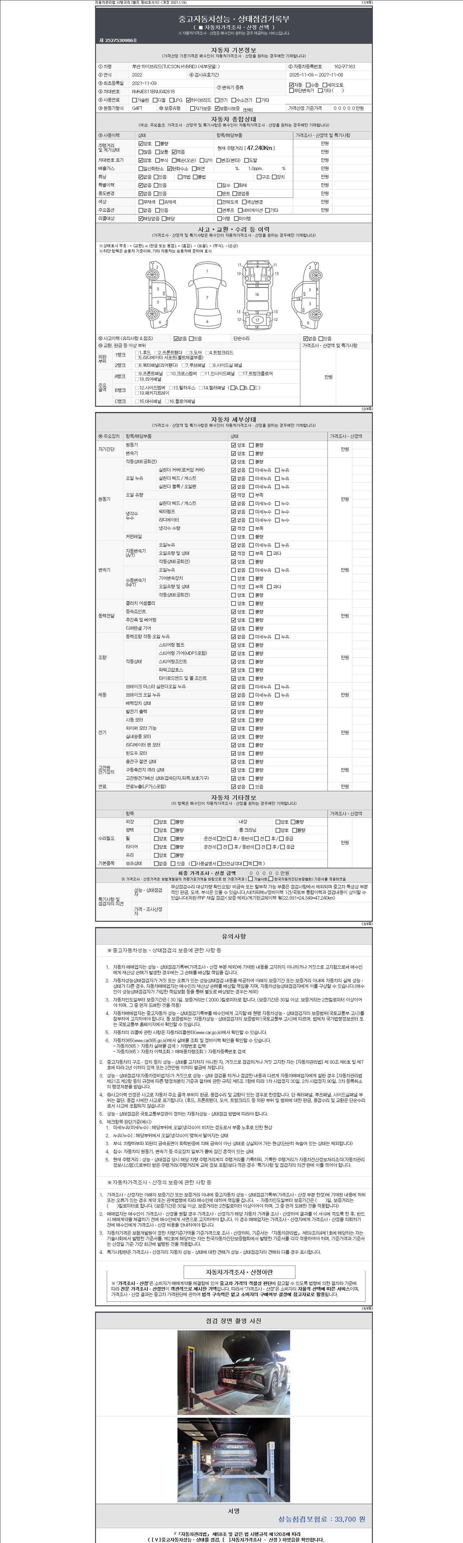 자동차관리법 시행규칙 제120조의 규정에 따라 별지 제 82호서식 《중고자동차 성능, 상태점검 기록부》를 발행한 성능, 상태점검자 및 매매자는 아래의 보증기간 또는 보증거리 이내의 중고자동차, 성능점검 기록부에 기재된 내용과 자동차의 실제 성능, 상태가 다른 경우 계약 또는 관계법령에 따라 매수인에 대하여 책임을 집니다.