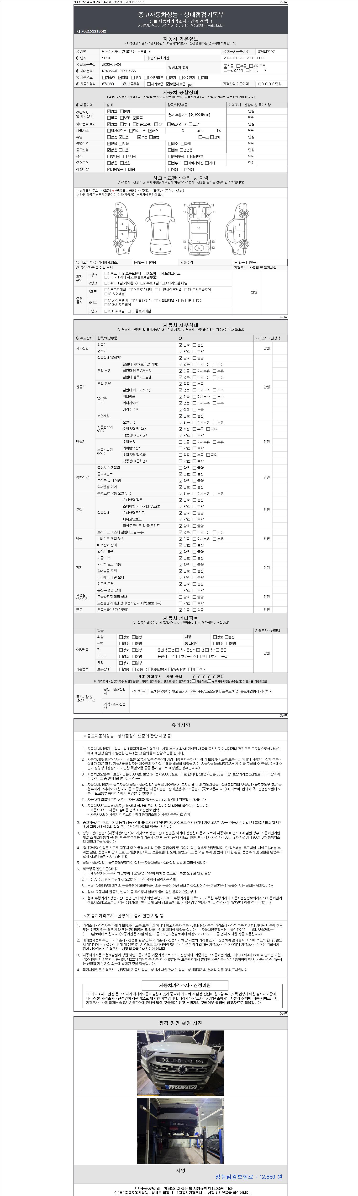 자동차관리법 시행규칙 제120조의 규정에 따라 별지 제 82호서식 《중고자동차 성능, 상태점검 기록부》를 발행한 성능, 상태점검자 및 매매자는 아래의 보증기간 또는 보증거리 이내의 중고자동차, 성능점검 기록부에 기재된 내용과 자동차의 실제 성능, 상태가 다른 경우 계약 또는 관계법령에 따라 매수인에 대하여 책임을 집니다.