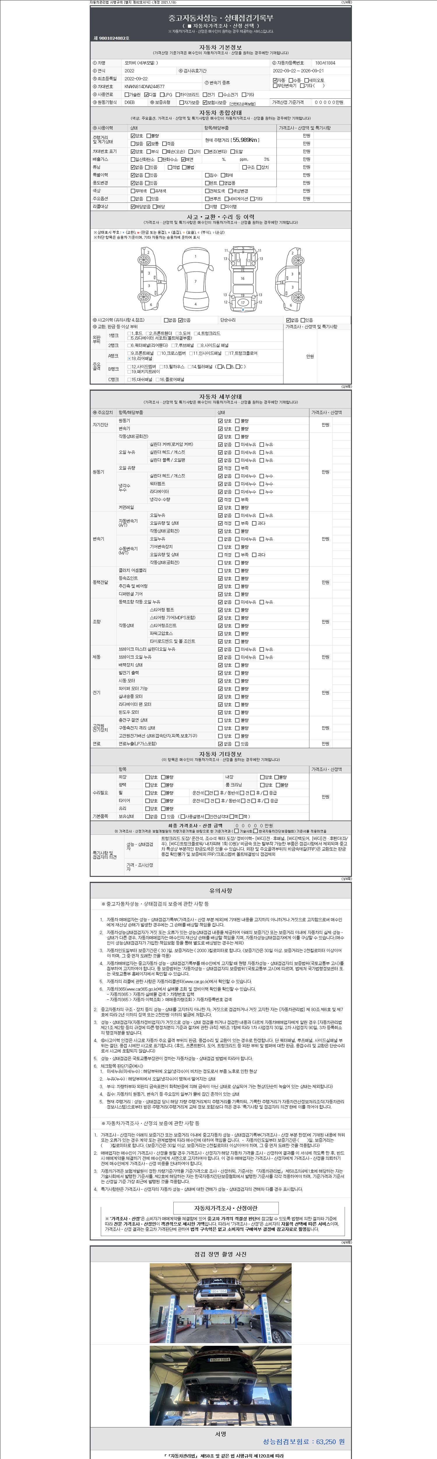 자동차관리법 시행규칙 제120조의 규정에 따라 별지 제 82호서식 《중고자동차 성능, 상태점검 기록부》를 발행한 성능, 상태점검자 및 매매자는 아래의 보증기간 또는 보증거리 이내의 중고자동차, 성능점검 기록부에 기재된 내용과 자동차의 실제 성능, 상태가 다른 경우 계약 또는 관계법령에 따라 매수인에 대하여 책임을 집니다.