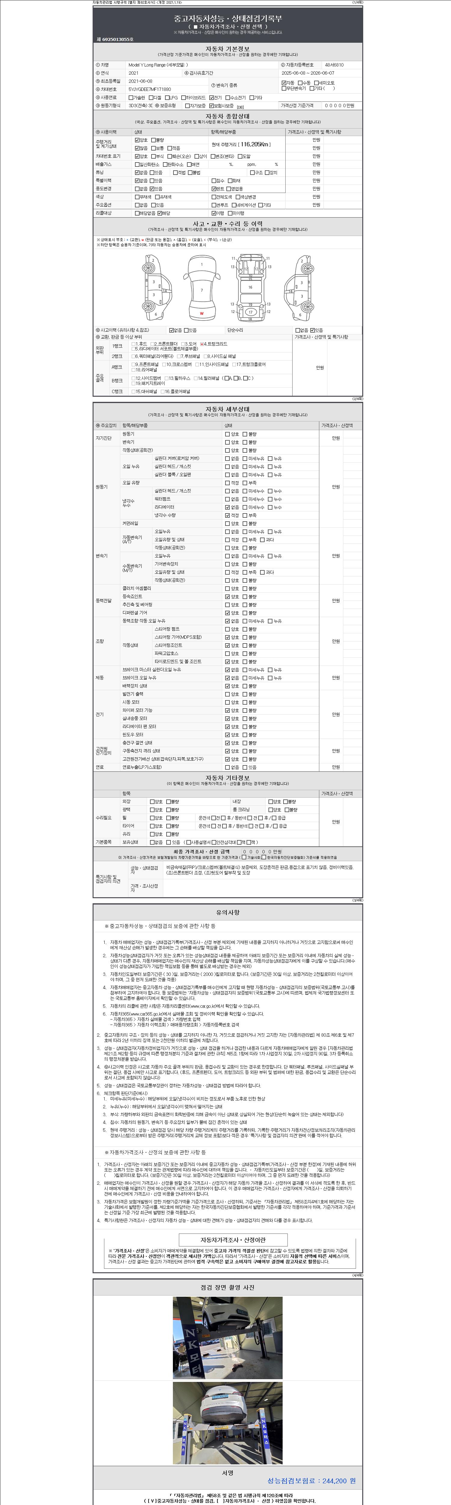 자동차관리법 시행규칙 제120조의 규정에 따라 별지 제 82호서식 《중고자동차 성능, 상태점검 기록부》를 발행한 성능, 상태점검자 및 매매자는 아래의 보증기간 또는 보증거리 이내의 중고자동차, 성능점검 기록부에 기재된 내용과 자동차의 실제 성능, 상태가 다른 경우 계약 또는 관계법령에 따라 매수인에 대하여 책임을 집니다.