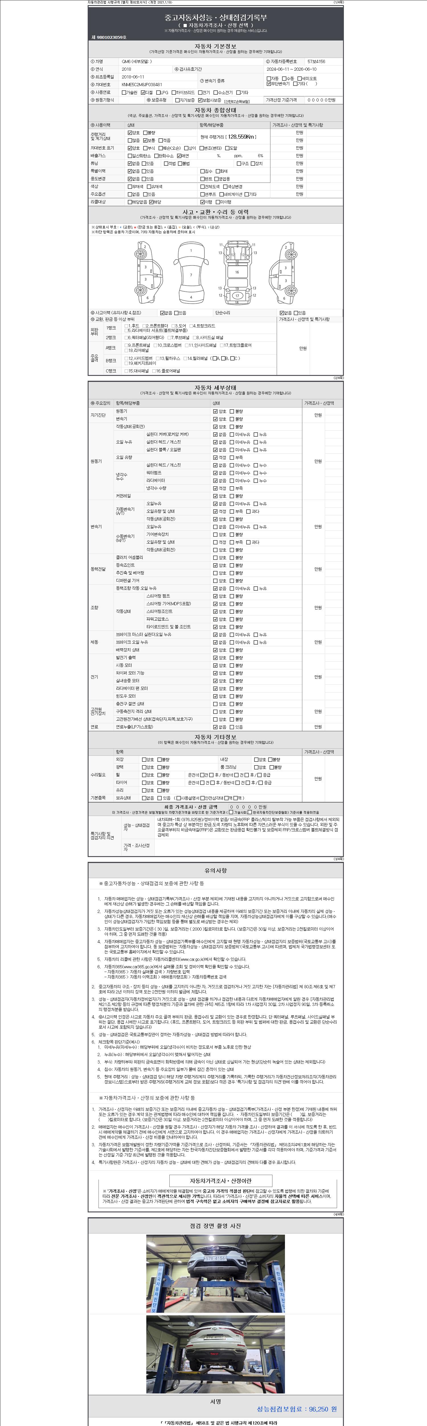 자동차관리법 시행규칙 제120조의 규정에 따라 별지 제 82호서식 《중고자동차 성능, 상태점검 기록부》를 발행한 성능, 상태점검자 및 매매자는 아래의 보증기간 또는 보증거리 이내의 중고자동차, 성능점검 기록부에 기재된 내용과 자동차의 실제 성능, 상태가 다른 경우 계약 또는 관계법령에 따라 매수인에 대하여 책임을 집니다.