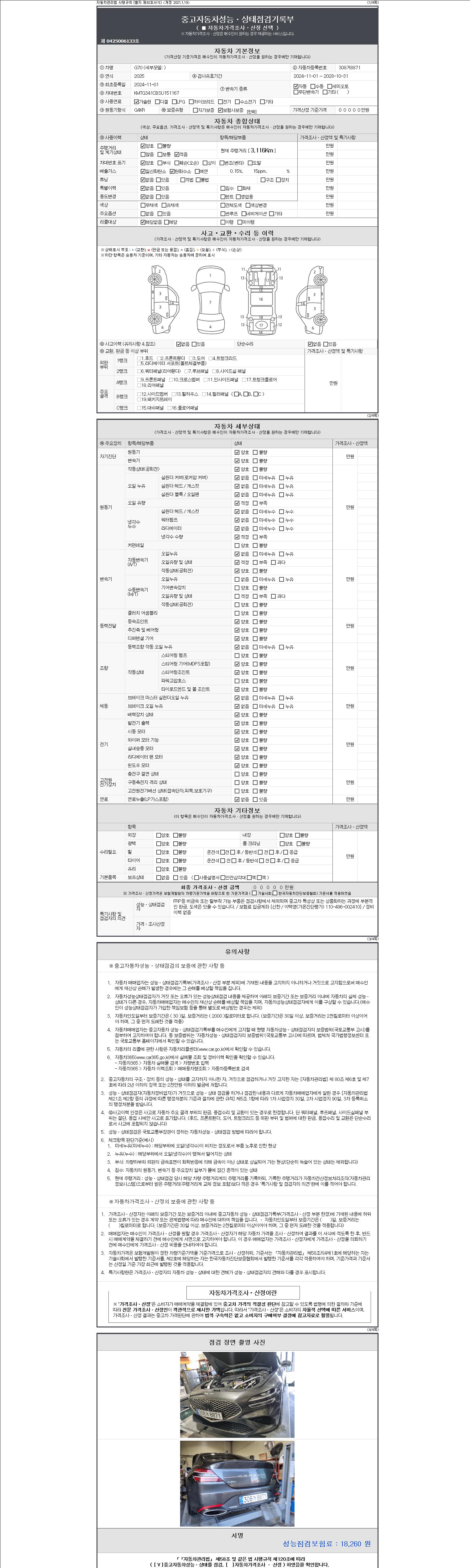 자동차관리법 시행규칙 제120조의 규정에 따라 별지 제 82호서식 《중고자동차 성능, 상태점검 기록부》를 발행한 성능, 상태점검자 및 매매자는 아래의 보증기간 또는 보증거리 이내의 중고자동차, 성능점검 기록부에 기재된 내용과 자동차의 실제 성능, 상태가 다른 경우 계약 또는 관계법령에 따라 매수인에 대하여 책임을 집니다.