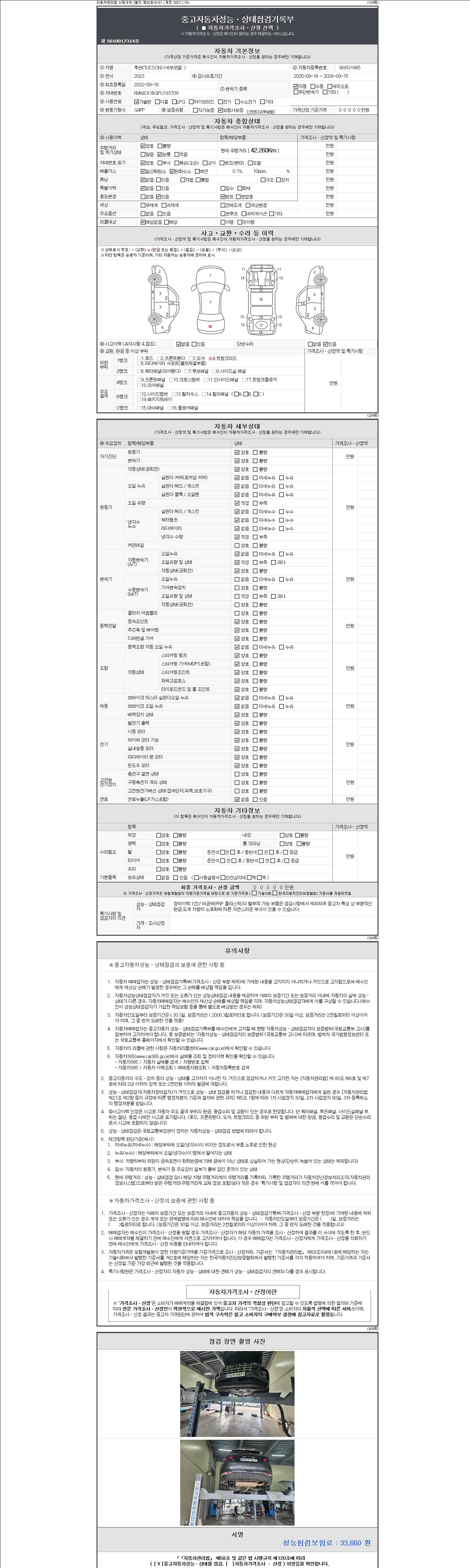 자동차관리법 시행규칙 제120조의 규정에 따라 별지 제 82호서식 《중고자동차 성능, 상태점검 기록부》를 발행한 성능, 상태점검자 및 매매자는 아래의 보증기간 또는 보증거리 이내의 중고자동차, 성능점검 기록부에 기재된 내용과 자동차의 실제 성능, 상태가 다른 경우 계약 또는 관계법령에 따라 매수인에 대하여 책임을 집니다.