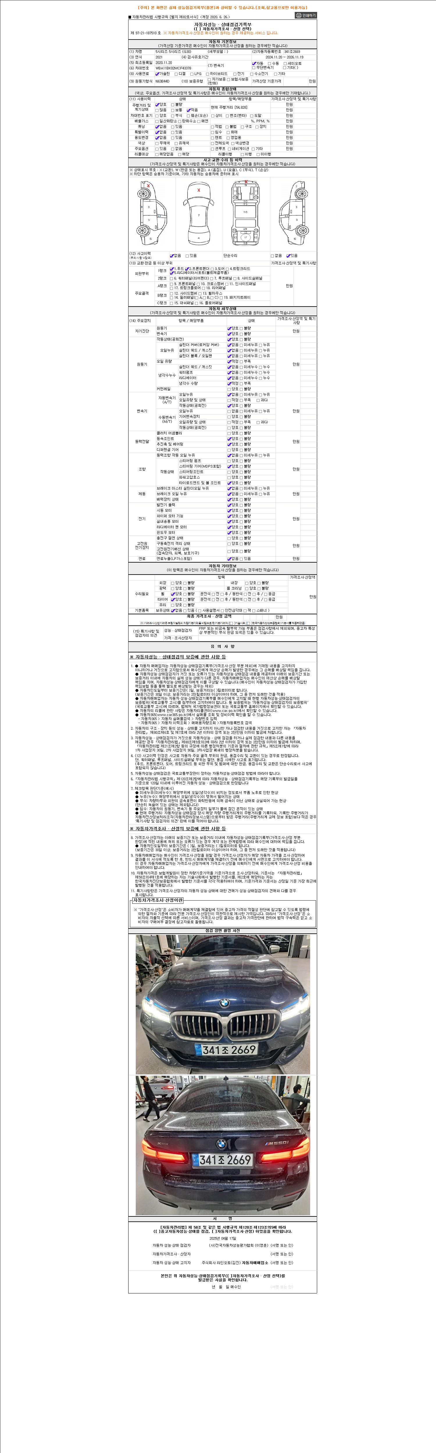 자동차관리법 시행규칙 제120조의 규정에 따라 별지 제 82호서식 《중고자동차 성능, 상태점검 기록부》를 발행한 성능, 상태점검자 및 매매자는 아래의 보증기간 또는 보증거리 이내의 중고자동차, 성능점검 기록부에 기재된 내용과 자동차의 실제 성능, 상태가 다른 경우 계약 또는 관계법령에 따라 매수인에 대하여 책임을 집니다.