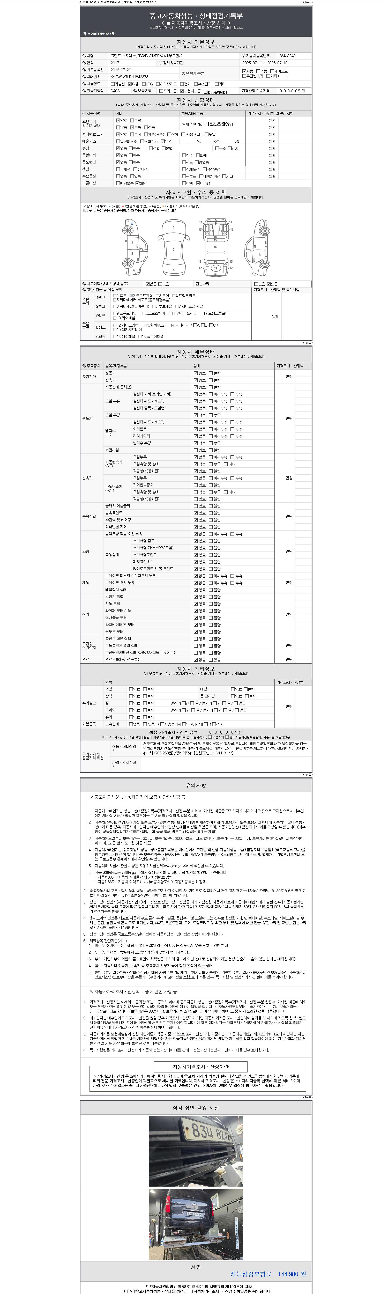 자동차관리법 시행규칙 제120조의 규정에 따라 별지 제 82호서식 《중고자동차 성능, 상태점검 기록부》를 발행한 성능, 상태점검자 및 매매자는 아래의 보증기간 또는 보증거리 이내의 중고자동차, 성능점검 기록부에 기재된 내용과 자동차의 실제 성능, 상태가 다른 경우 계약 또는 관계법령에 따라 매수인에 대하여 책임을 집니다.