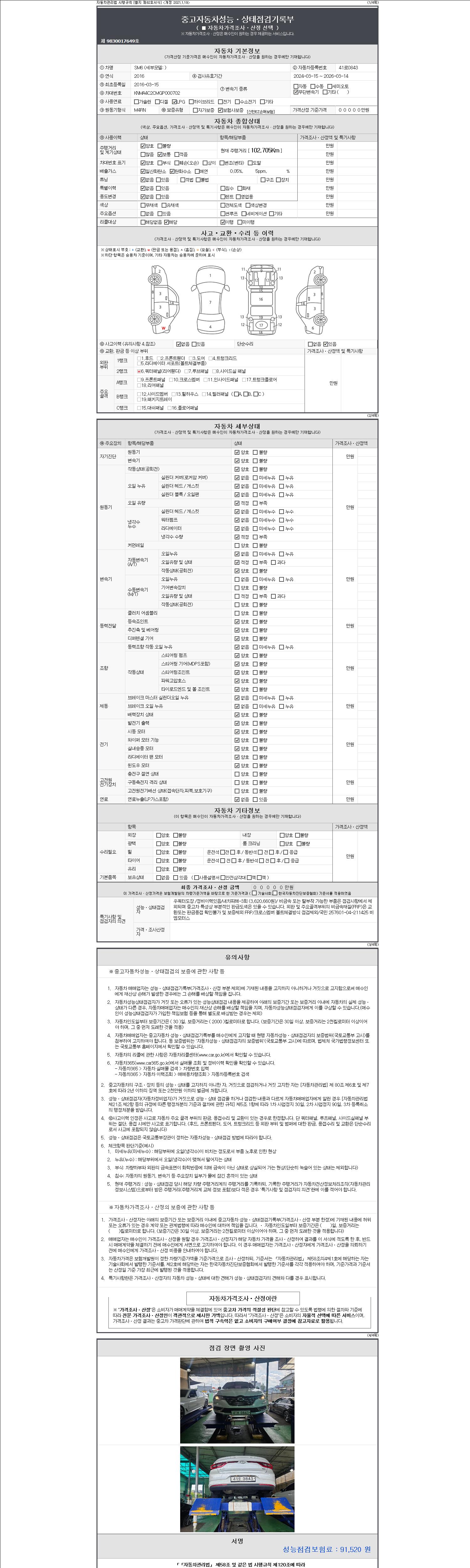 자동차관리법 시행규칙 제120조의 규정에 따라 별지 제 82호서식 《중고자동차 성능, 상태점검 기록부》를 발행한 성능, 상태점검자 및 매매자는 아래의 보증기간 또는 보증거리 이내의 중고자동차, 성능점검 기록부에 기재된 내용과 자동차의 실제 성능, 상태가 다른 경우 계약 또는 관계법령에 따라 매수인에 대하여 책임을 집니다.