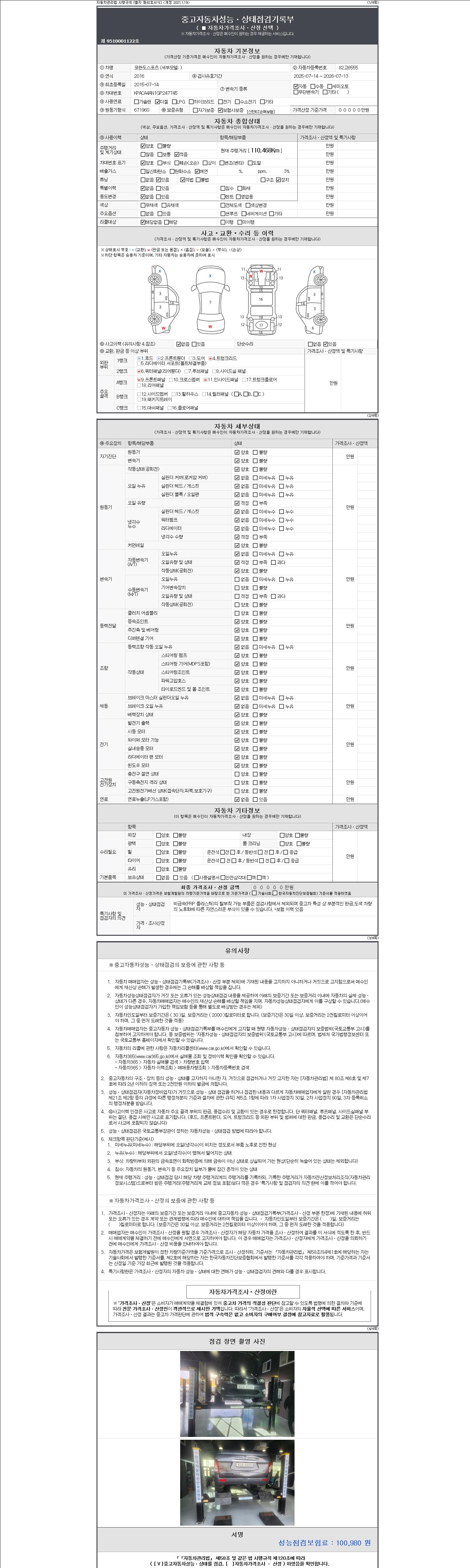 자동차관리법 시행규칙 제120조의 규정에 따라 별지 제 82호서식 《중고자동차 성능, 상태점검 기록부》를 발행한 성능, 상태점검자 및 매매자는 아래의 보증기간 또는 보증거리 이내의 중고자동차, 성능점검 기록부에 기재된 내용과 자동차의 실제 성능, 상태가 다른 경우 계약 또는 관계법령에 따라 매수인에 대하여 책임을 집니다.