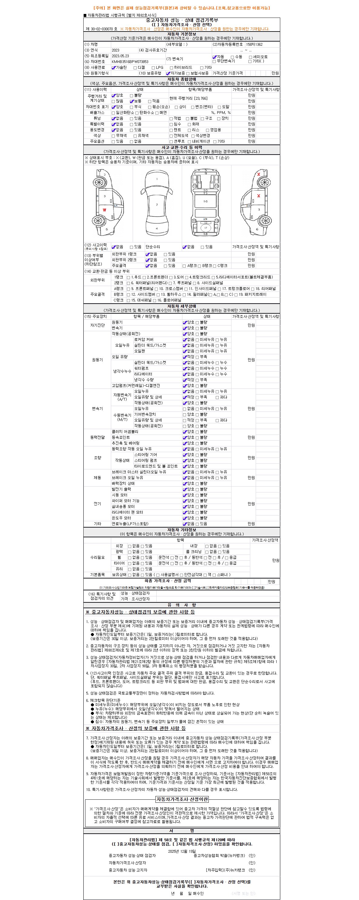 -중고자동차 매매업자를 통해 차량을 구입하실 경우 반드시 "중고자동차 성능, 상태점검 기록부"를 교뷰 받으셔야 하며, 매매업자는 반드시 의무 교부 하여야 압니다.