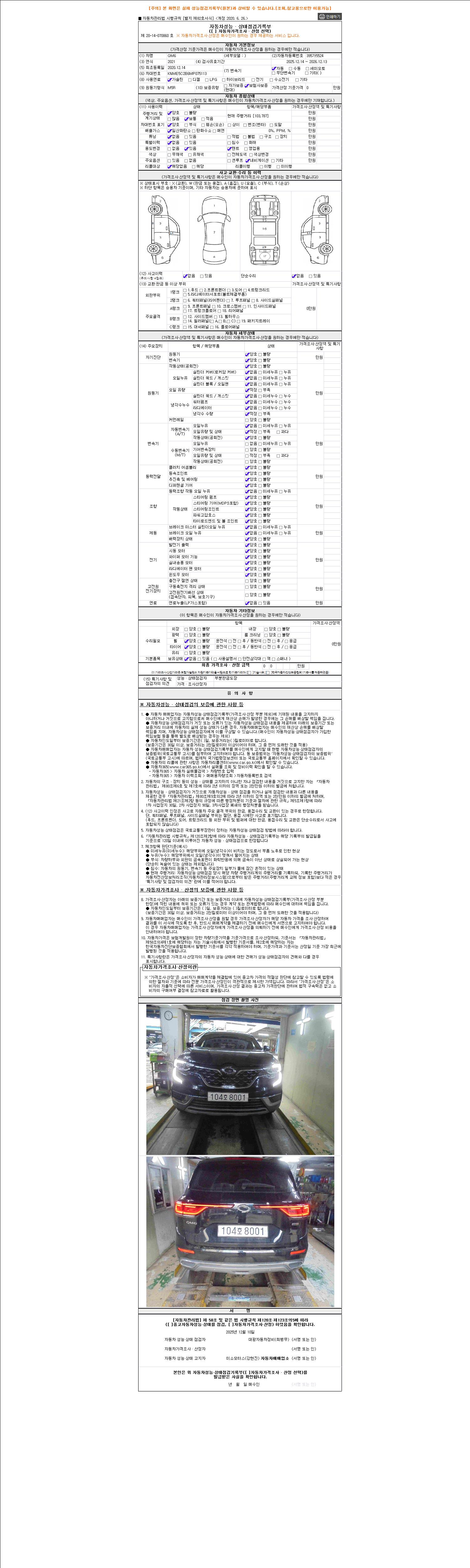 자동차관리법 시행규칙 제120조의 규정에 따라 별지 제 82호서식 《중고자동차 성능, 상태점검 기록부》를 발행한 성능, 상태점검자 및 매매자는 아래의 보증기간 또는 보증거리 이내의 중고자동차, 성능점검 기록부에 기재된 내용과 자동차의 실제 성능, 상태가 다른 경우 계약 또는 관계법령에 따라 매수인에 대하여 책임을 집니다.
