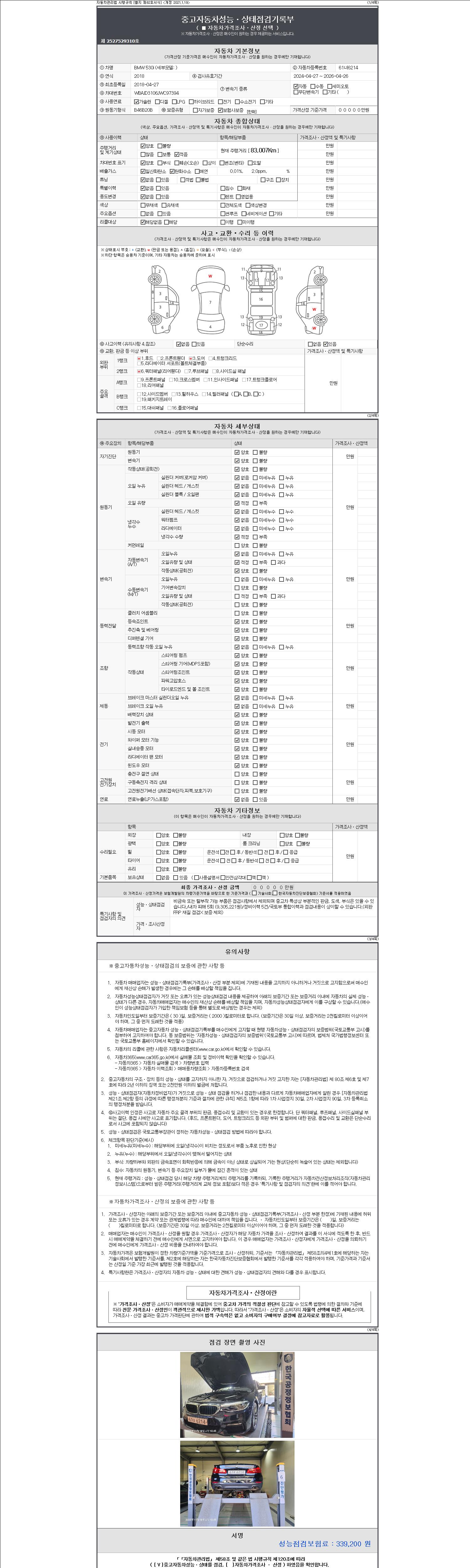 자동차관리법 시행규칙 제120조의 규정에 따라 별지 제 82호서식 《중고자동차 성능, 상태점검 기록부》를 발행한 성능, 상태점검자 및 매매자는 아래의 보증기간 또는 보증거리 이내의 중고자동차, 성능점검 기록부에 기재된 내용과 자동차의 실제 성능, 상태가 다른 경우 계약 또는 관계법령에 따라 매수인에 대하여 책임을 집니다.