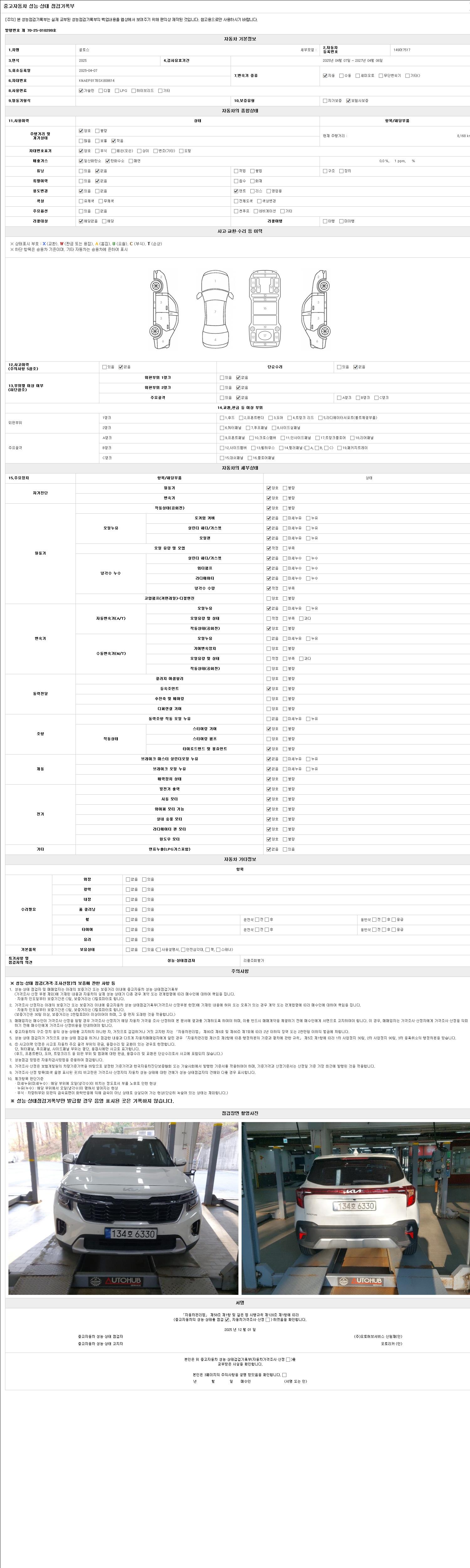 자동차관리법 시행규칙 제120조의 규정에 따라 별지 제 82호서식 《중고자동차 성능, 상태점검 기록부》를 발행한 성능, 상태점검자 및 매매자는 아래의 보증기간 또는 보증거리 이내의 중고자동차, 성능점검 기록부에 기재된 내용과 자동차의 실제 성능, 상태가 다른 경우 계약 또는 관계법령에 따라 매수인에 대하여 책임을 집니다.