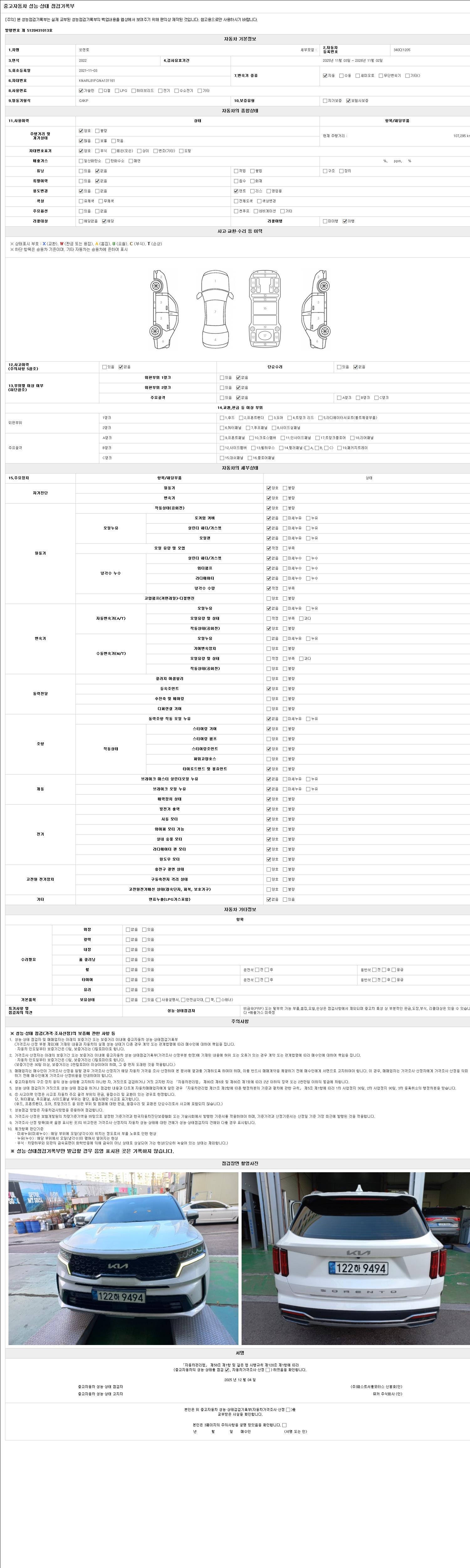-중고자동차 매매업자를 통해 차량을 구입하실 경우 반드시 "중고자동차 성능, 상태점검 기록부"를 교뷰 받으셔야 하며, 매매업자는 반드시 의무 교부 하여야 압니다.