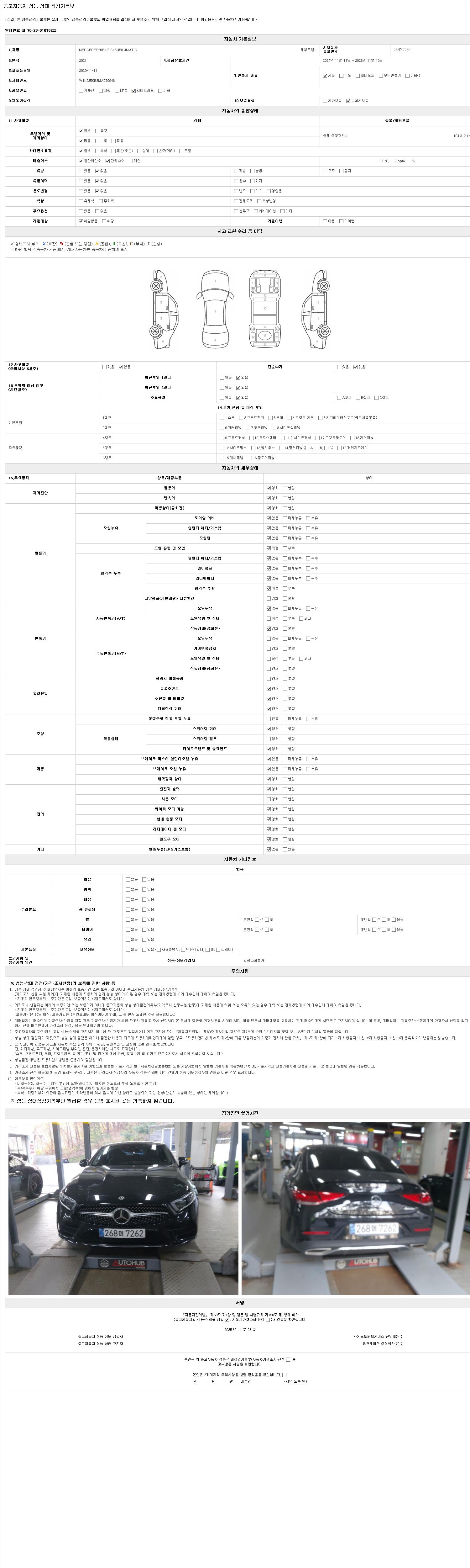자동차관리법 시행규칙 제120조의 규정에 따라 별지 제 82호서식 《중고자동차 성능, 상태점검 기록부》를 발행한 성능, 상태점검자 및 매매자는 아래의 보증기간 또는 보증거리 이내의 중고자동차, 성능점검 기록부에 기재된 내용과 자동차의 실제 성능, 상태가 다른 경우 계약 또는 관계법령에 따라 매수인에 대하여 책임을 집니다.