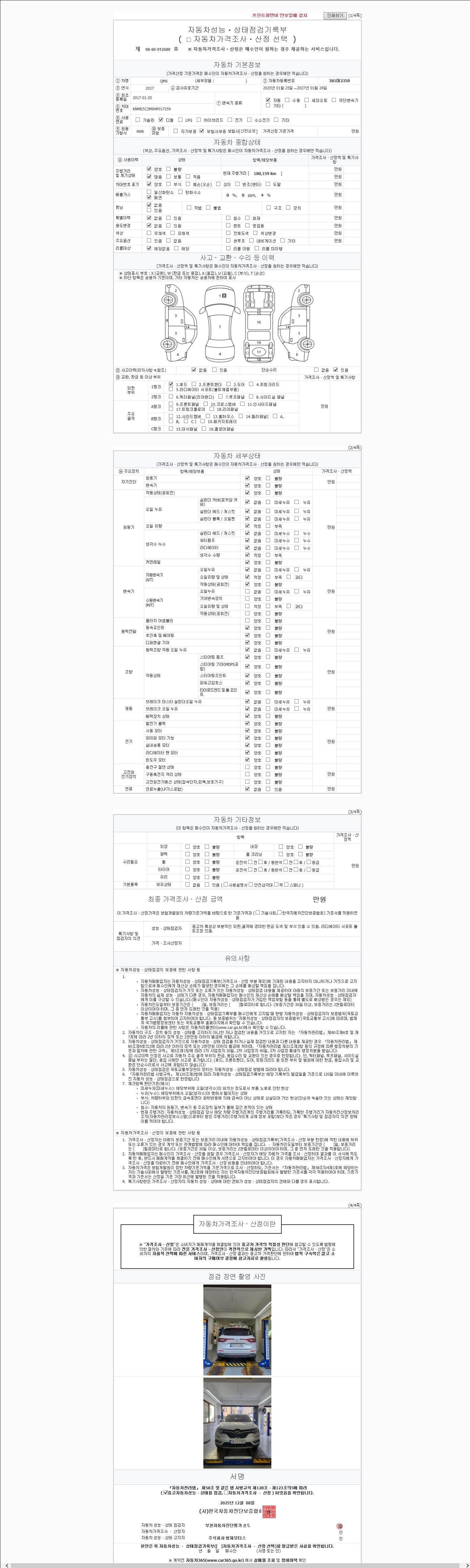 자동차관리법 시행규칙 제120조의 규정에 따라 별지 제 82호서식 《중고자동차 성능, 상태점검 기록부》를 발행한 성능, 상태점검자 및 매매자는 아래의 보증기간 또는 보증거리 이내의 중고자동차, 성능점검 기록부에 기재된 내용과 자동차의 실제 성능, 상태가 다른 경우 계약 또는 관계법령에 따라 매수인에 대하여 책임을 집니다.