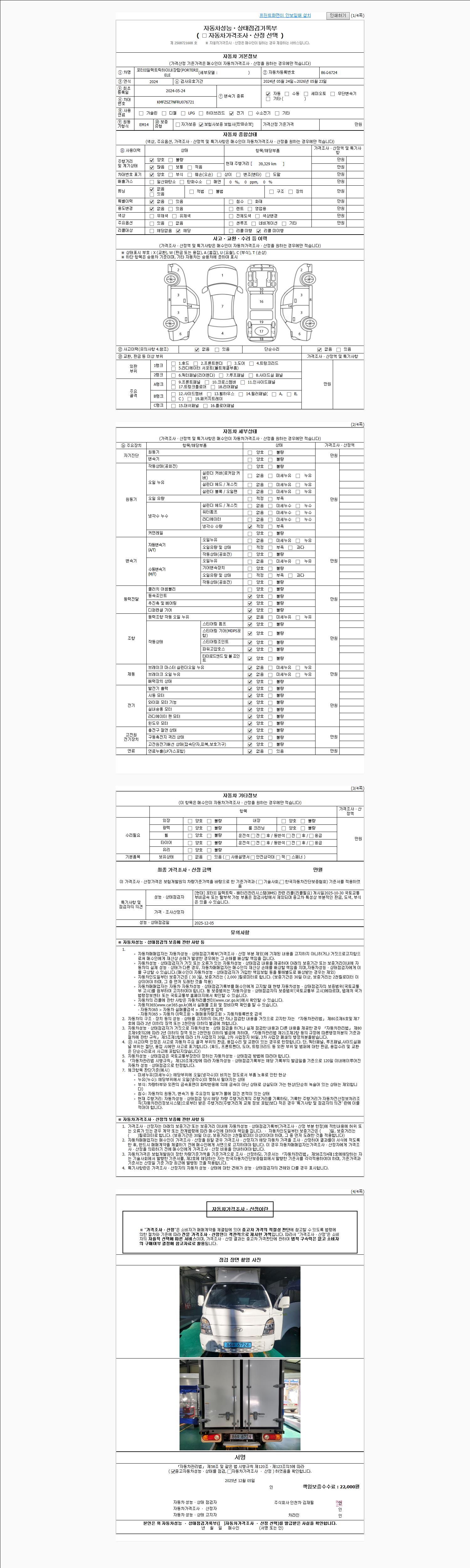 자동차관리법 시행규칙 제120조의 규정에 따라 별지 제 82호서식 《중고자동차 성능, 상태점검 기록부》를 발행한 성능, 상태점검자 및 매매자는 아래의 보증기간 또는 보증거리 이내의 중고자동차, 성능점검 기록부에 기재된 내용과 자동차의 실제 성능, 상태가 다른 경우 계약 또는 관계법령에 따라 매수인에 대하여 책임을 집니다.