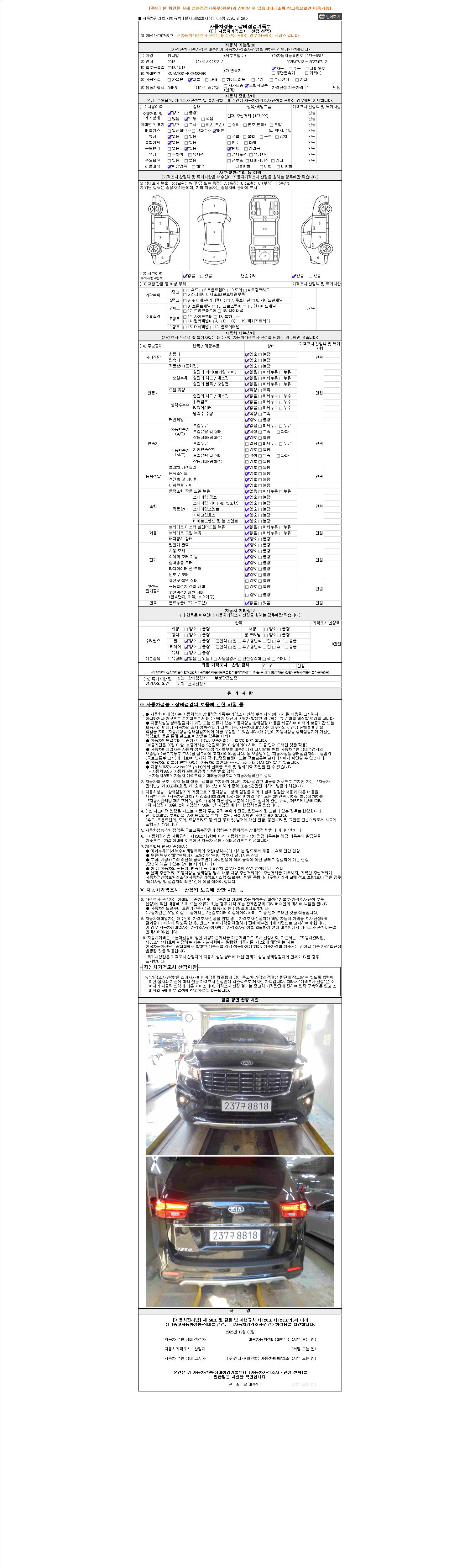 자동차관리법 시행규칙 제120조의 규정에 따라 별지 제 82호서식 《중고자동차 성능, 상태점검 기록부》를 발행한 성능, 상태점검자 및 매매자는 아래의 보증기간 또는 보증거리 이내의 중고자동차, 성능점검 기록부에 기재된 내용과 자동차의 실제 성능, 상태가 다른 경우 계약 또는 관계법령에 따라 매수인에 대하여 책임을 집니다.