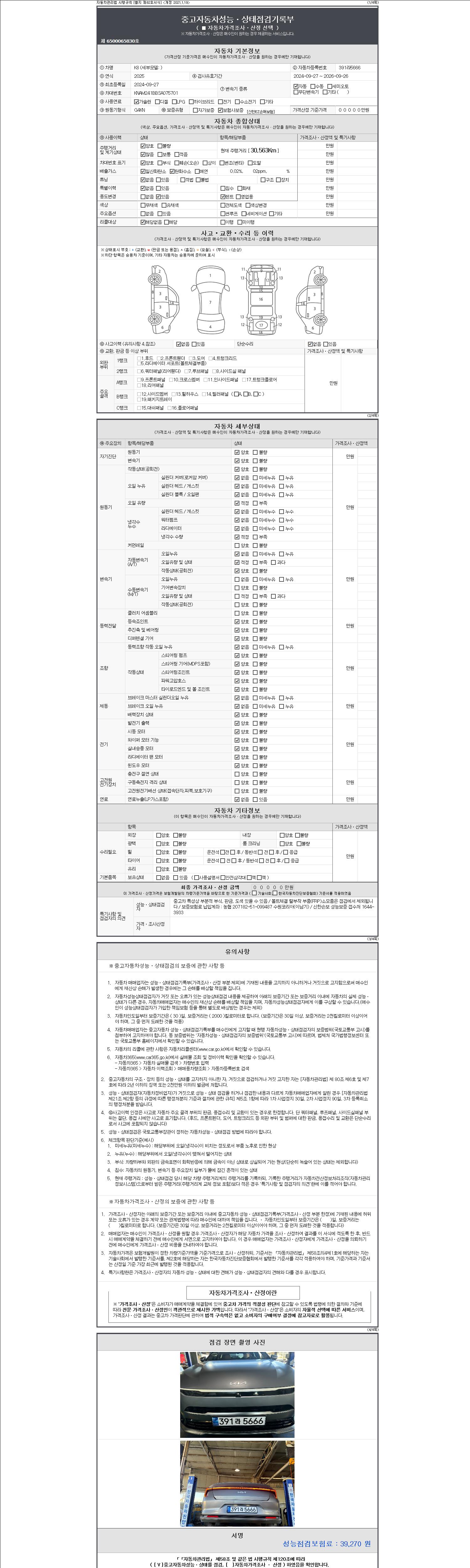 자동차관리법 시행규칙 제120조의 규정에 따라 별지 제 82호서식 《중고자동차 성능, 상태점검 기록부》를 발행한 성능, 상태점검자 및 매매자는 아래의 보증기간 또는 보증거리 이내의 중고자동차, 성능점검 기록부에 기재된 내용과 자동차의 실제 성능, 상태가 다른 경우 계약 또는 관계법령에 따라 매수인에 대하여 책임을 집니다.