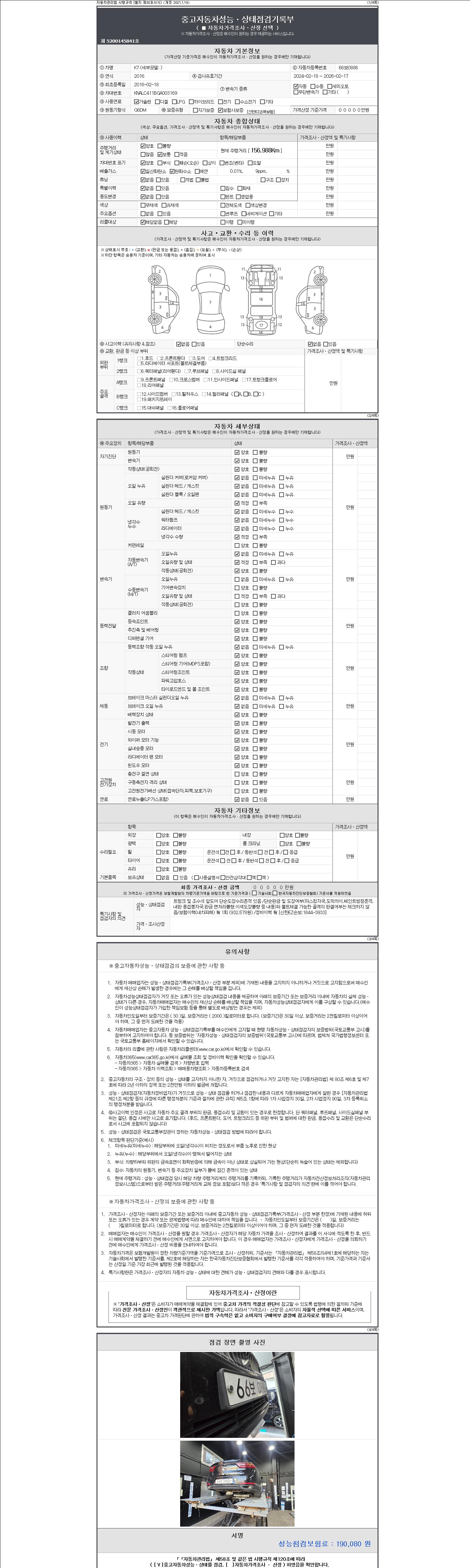 자동차관리법 시행규칙 제120조의 규정에 따라 별지 제 82호서식 《중고자동차 성능, 상태점검 기록부》를 발행한 성능, 상태점검자 및 매매자는 아래의 보증기간 또는 보증거리 이내의 중고자동차, 성능점검 기록부에 기재된 내용과 자동차의 실제 성능, 상태가 다른 경우 계약 또는 관계법령에 따라 매수인에 대하여 책임을 집니다.