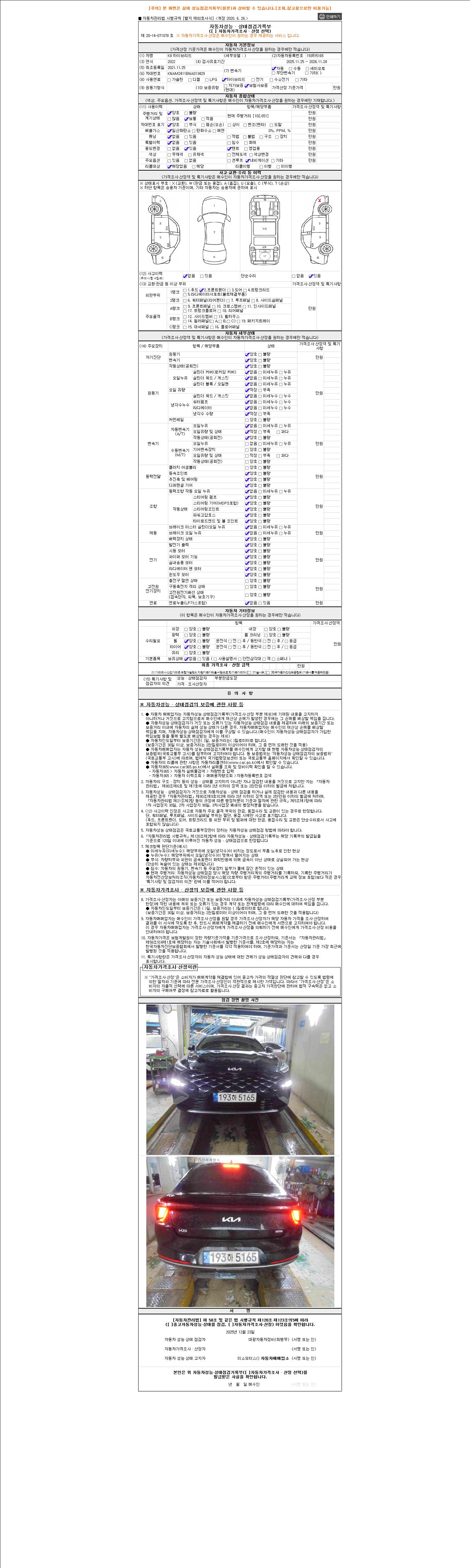 자동차관리법 시행규칙 제120조의 규정에 따라 별지 제 82호서식 《중고자동차 성능, 상태점검 기록부》를 발행한 성능, 상태점검자 및 매매자는 아래의 보증기간 또는 보증거리 이내의 중고자동차, 성능점검 기록부에 기재된 내용과 자동차의 실제 성능, 상태가 다른 경우 계약 또는 관계법령에 따라 매수인에 대하여 책임을 집니다.