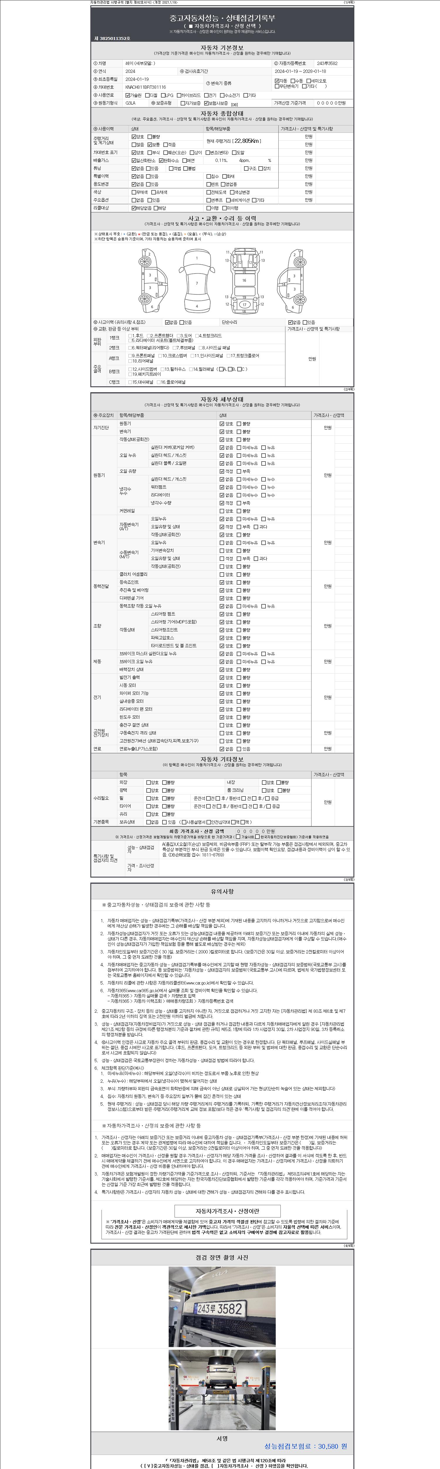 자동차관리법 시행규칙 제120조의 규정에 따라 별지 제 82호서식 《중고자동차 성능, 상태점검 기록부》를 발행한 성능, 상태점검자 및 매매자는 아래의 보증기간 또는 보증거리 이내의 중고자동차, 성능점검 기록부에 기재된 내용과 자동차의 실제 성능, 상태가 다른 경우 계약 또는 관계법령에 따라 매수인에 대하여 책임을 집니다.