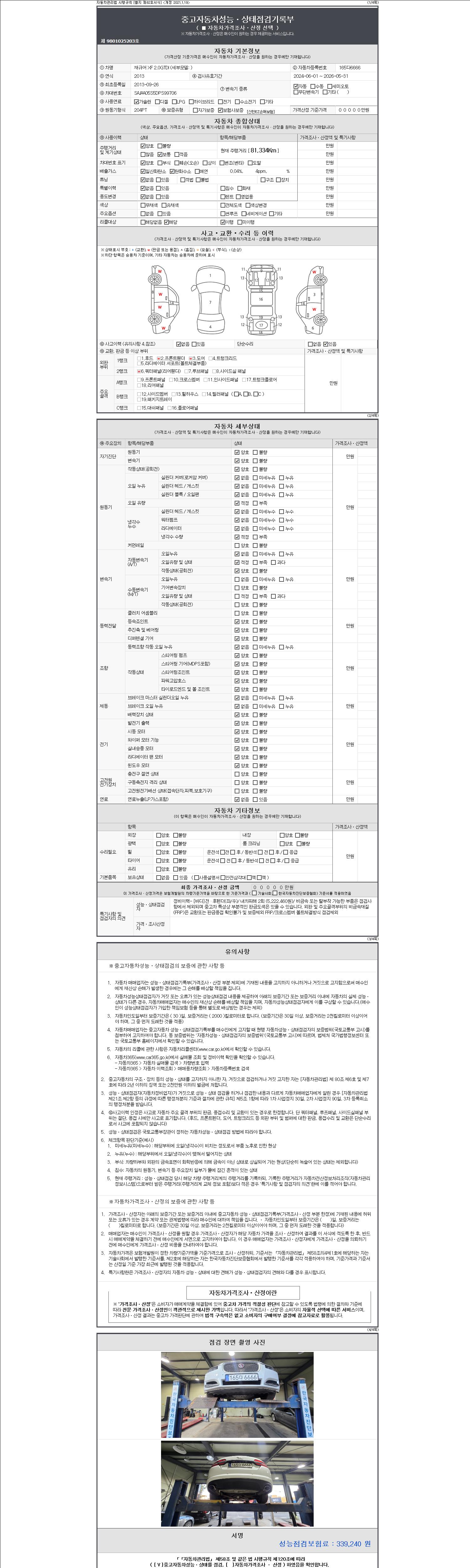 자동차관리법 시행규칙 제120조의 규정에 따라 별지 제 82호서식 《중고자동차 성능, 상태점검 기록부》를 발행한 성능, 상태점검자 및 매매자는 아래의 보증기간 또는 보증거리 이내의 중고자동차, 성능점검 기록부에 기재된 내용과 자동차의 실제 성능, 상태가 다른 경우 계약 또는 관계법령에 따라 매수인에 대하여 책임을 집니다.