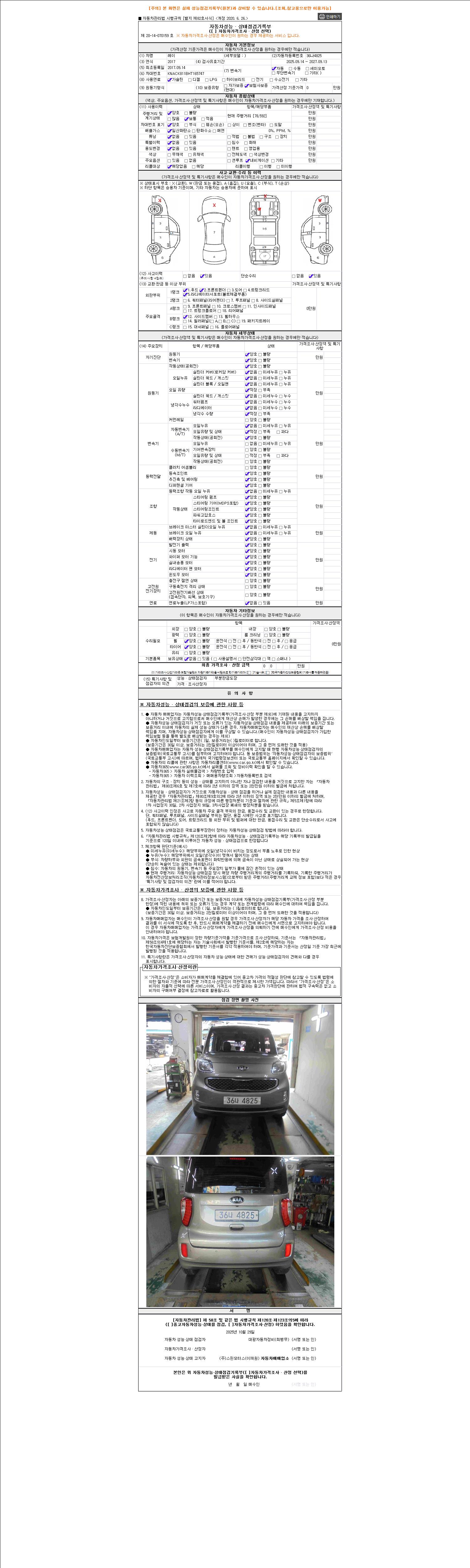 자동차관리법 시행규칙 제120조의 규정에 따라 별지 제 82호서식 《중고자동차 성능, 상태점검 기록부》를 발행한 성능, 상태점검자 및 매매자는 아래의 보증기간 또는 보증거리 이내의 중고자동차, 성능점검 기록부에 기재된 내용과 자동차의 실제 성능, 상태가 다른 경우 계약 또는 관계법령에 따라 매수인에 대하여 책임을 집니다.