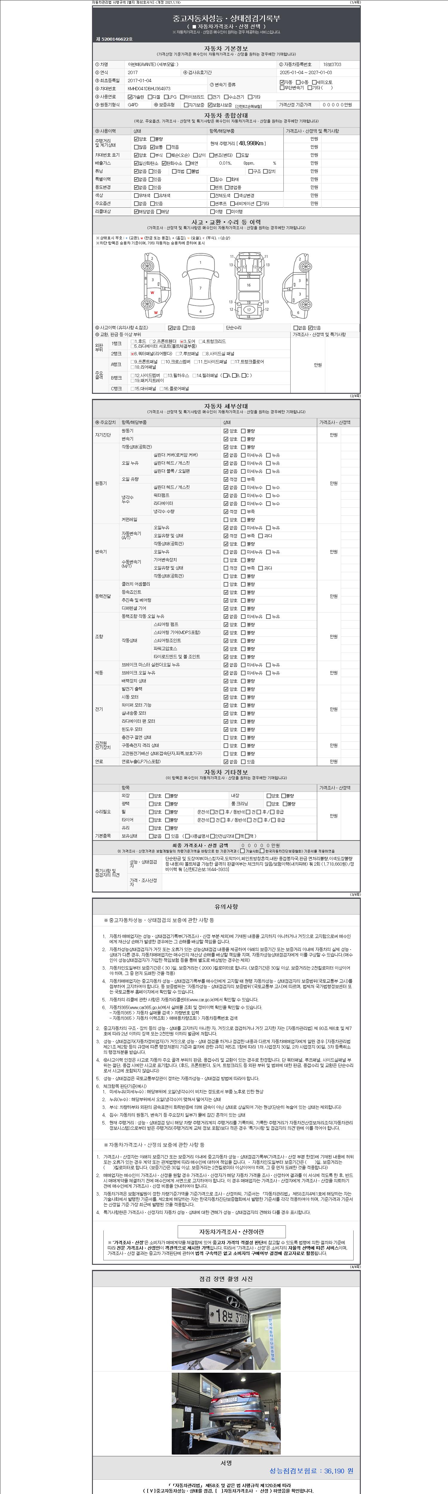 자동차관리법 시행규칙 제120조의 규정에 따라 별지 제 82호서식 《중고자동차 성능, 상태점검 기록부》를 발행한 성능, 상태점검자 및 매매자는 아래의 보증기간 또는 보증거리 이내의 중고자동차, 성능점검 기록부에 기재된 내용과 자동차의 실제 성능, 상태가 다른 경우 계약 또는 관계법령에 따라 매수인에 대하여 책임을 집니다.