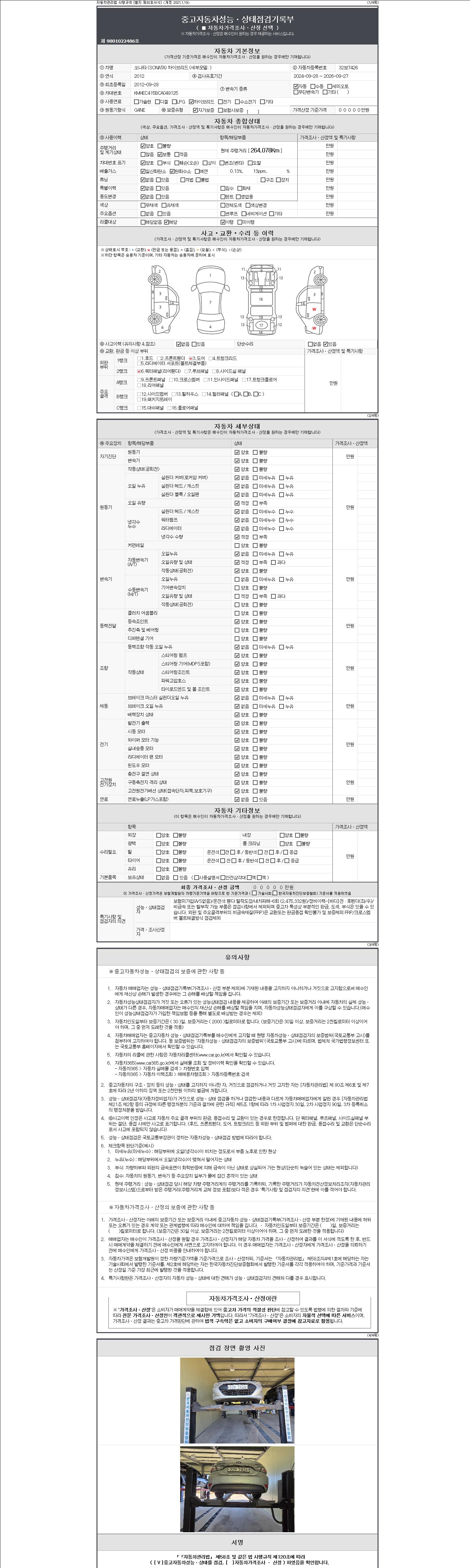-중고자동차 매매업자를 통해 차량을 구입하실 경우 반드시 "중고자동차 성능, 상태점검 기록부"를 교뷰 받으셔야 하며, 매매업자는 반드시 의무 교부 하여야 압니다.