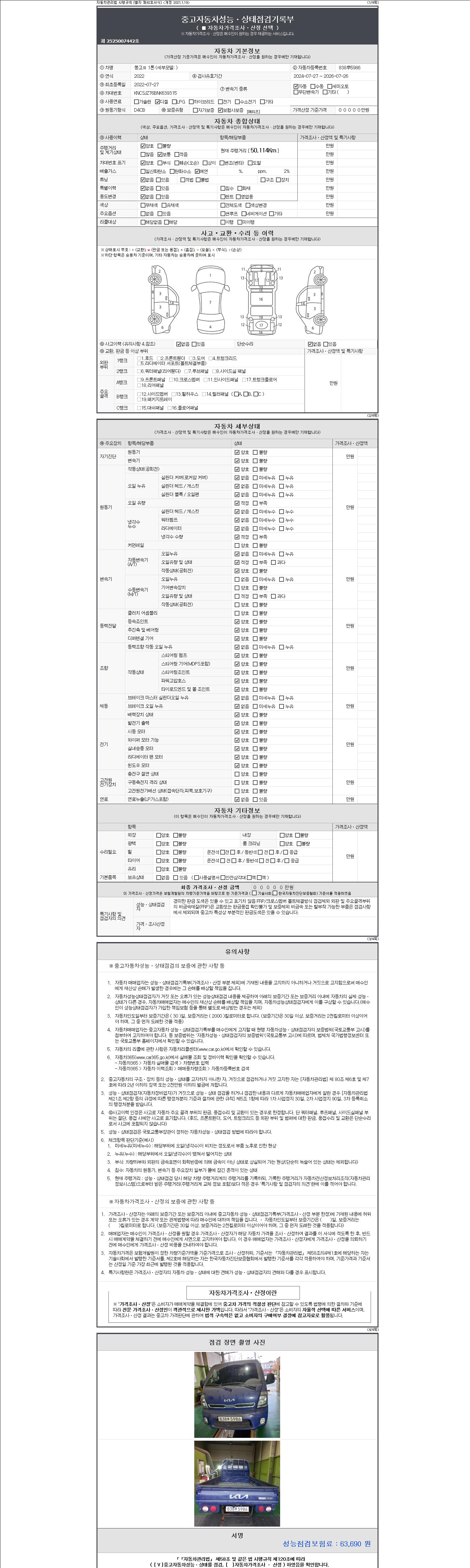 자동차관리법 시행규칙 제120조의 규정에 따라 별지 제 82호서식 《중고자동차 성능, 상태점검 기록부》를 발행한 성능, 상태점검자 및 매매자는 아래의 보증기간 또는 보증거리 이내의 중고자동차, 성능점검 기록부에 기재된 내용과 자동차의 실제 성능, 상태가 다른 경우 계약 또는 관계법령에 따라 매수인에 대하여 책임을 집니다.