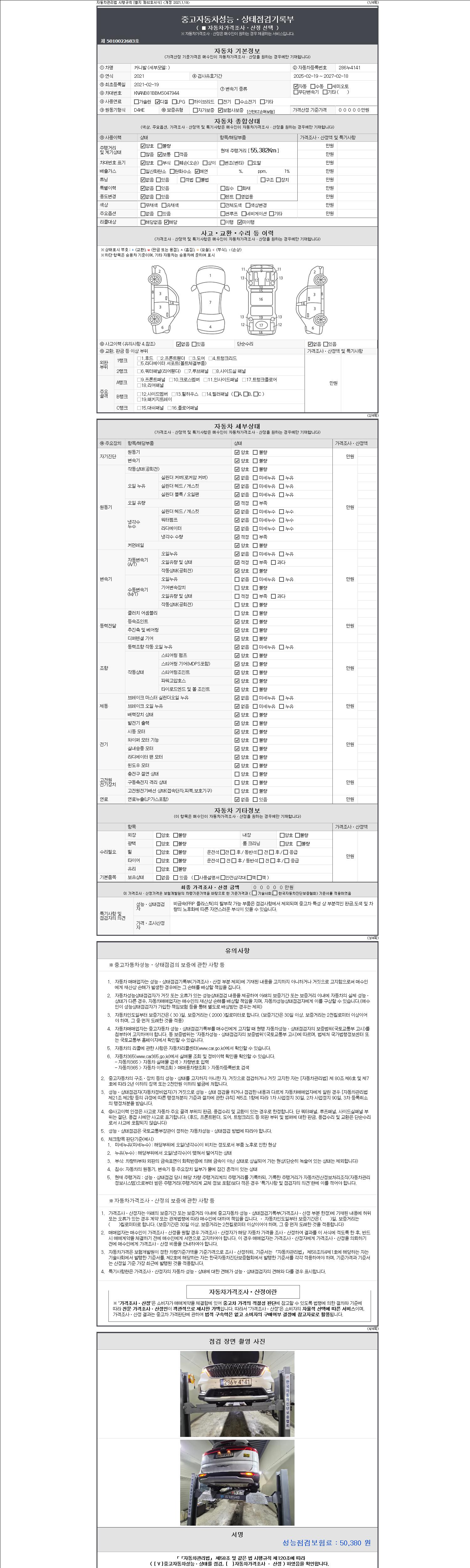 자동차관리법 시행규칙 제120조의 규정에 따라 별지 제 82호서식 《중고자동차 성능, 상태점검 기록부》를 발행한 성능, 상태점검자 및 매매자는 아래의 보증기간 또는 보증거리 이내의 중고자동차, 성능점검 기록부에 기재된 내용과 자동차의 실제 성능, 상태가 다른 경우 계약 또는 관계법령에 따라 매수인에 대하여 책임을 집니다.