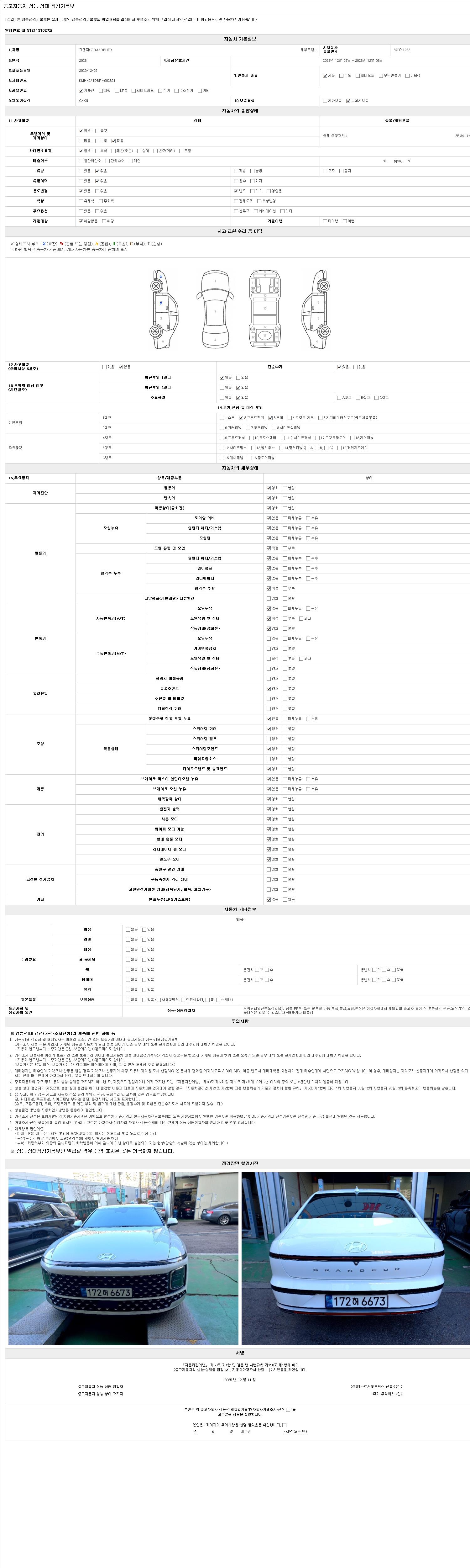 사고유무 성능기록부 참조 제시번호 제 2025041163 호