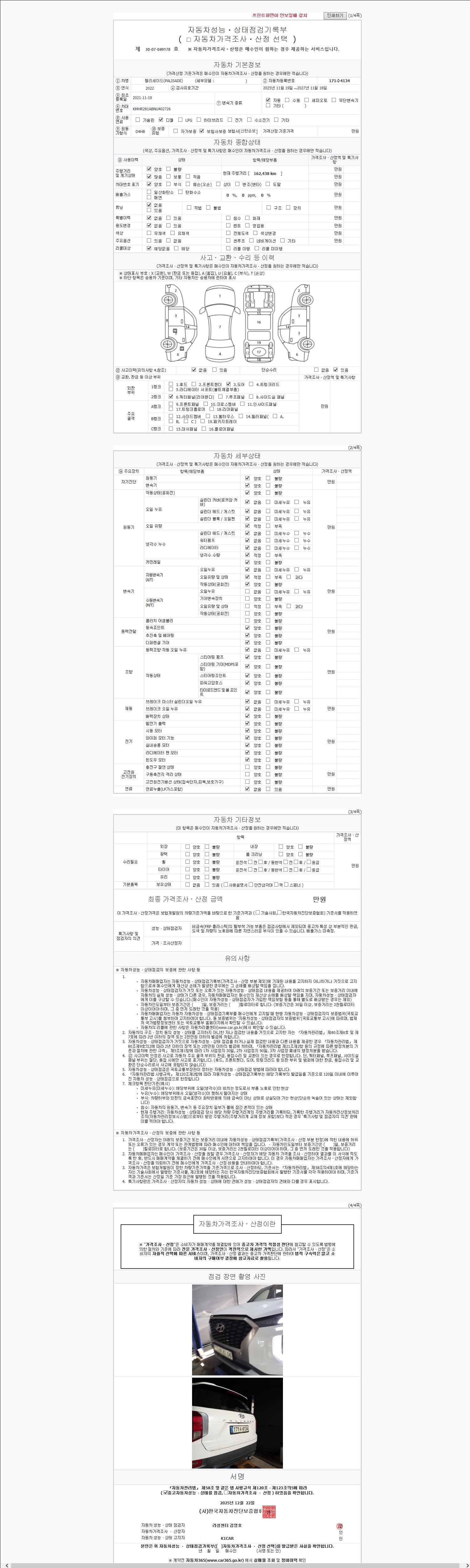 -중고자동차 매매업자를 통해 차량을 구입하실 경우 반드시 "중고자동차 성능, 상태점검 기록부"를 교뷰 받으셔야 하며, 매매업자는 반드시 의무 교부 하여야 압니다.