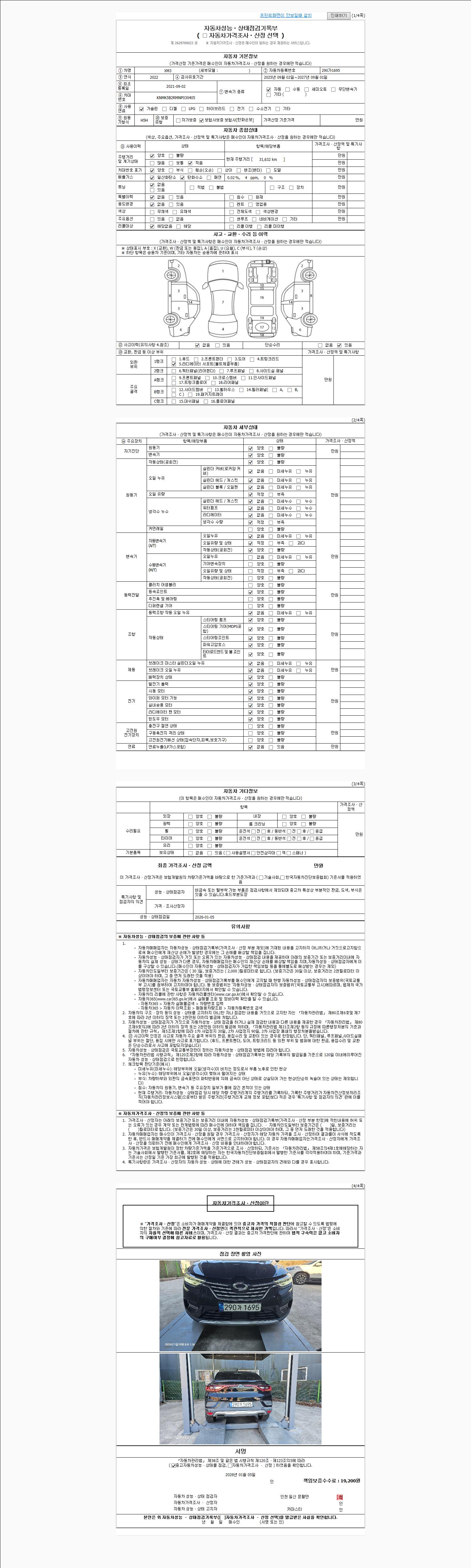 자동차관리법 시행규칙 제120조의 규정에 따라 별지 제 82호서식 《중고자동차 성능, 상태점검 기록부》를 발행한 성능, 상태점검자 및 매매자는 아래의 보증기간 또는 보증거리 이내의 중고자동차, 성능점검 기록부에 기재된 내용과 자동차의 실제 성능, 상태가 다른 경우 계약 또는 관계법령에 따라 매수인에 대하여 책임을 집니다.