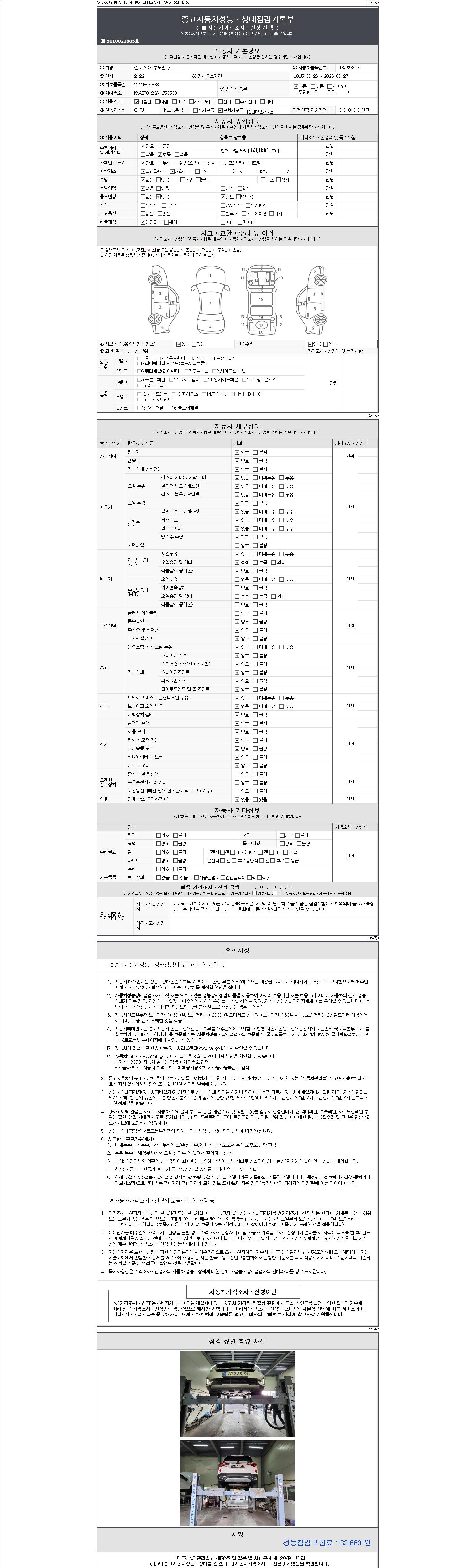 자동차관리법 시행규칙 제120조의 규정에 따라 별지 제 82호서식 《중고자동차 성능, 상태점검 기록부》를 발행한 성능, 상태점검자 및 매매자는 아래의 보증기간 또는 보증거리 이내의 중고자동차, 성능점검 기록부에 기재된 내용과 자동차의 실제 성능, 상태가 다른 경우 계약 또는 관계법령에 따라 매수인에 대하여 책임을 집니다.