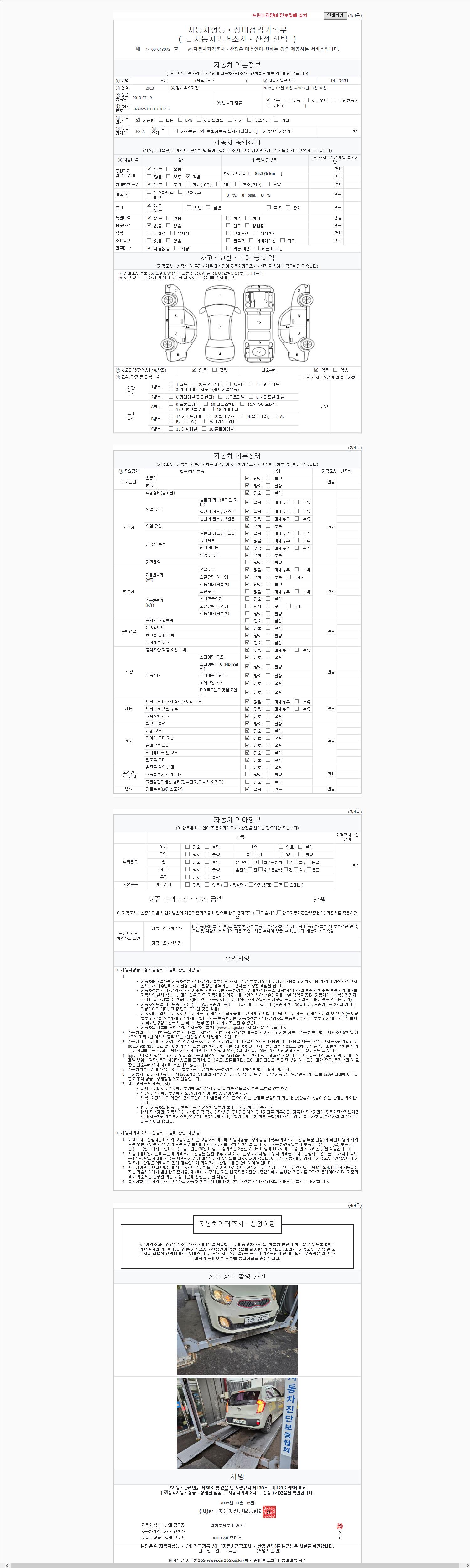 사고유무 성능기록부 참조 제시번호 제 2025218002 호