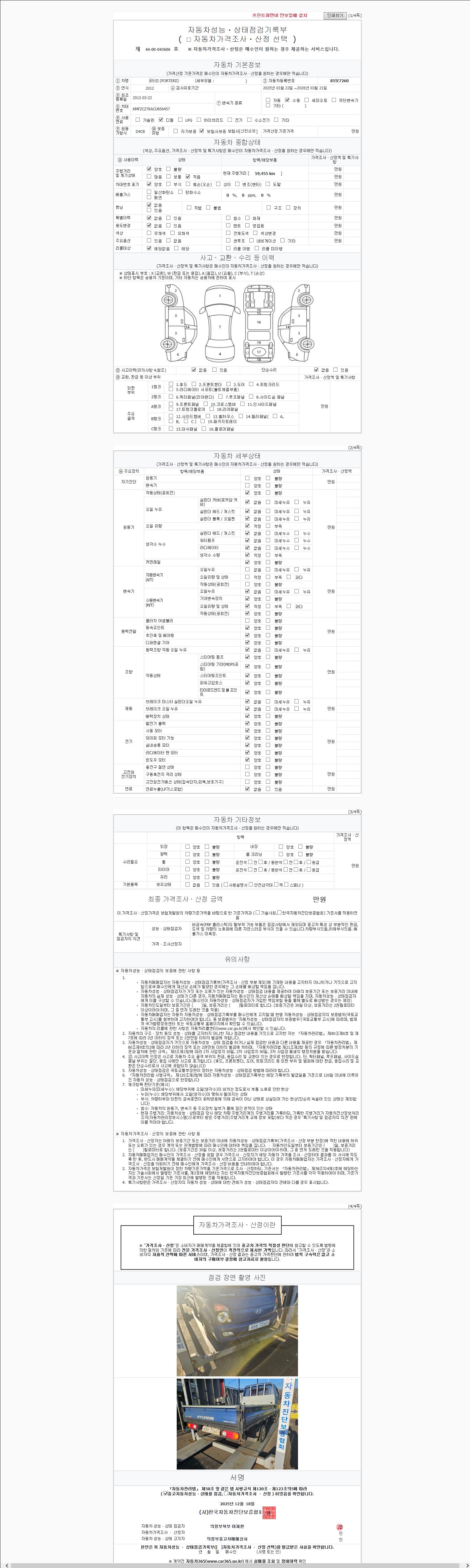 -중고자동차 매매업자를 통해 차량을 구입하실 경우 반드시 "중고자동차 성능, 상태점검 기록부"를 교뷰 받으셔야 하며, 매매업자는 반드시 의무 교부 하여야 압니다.