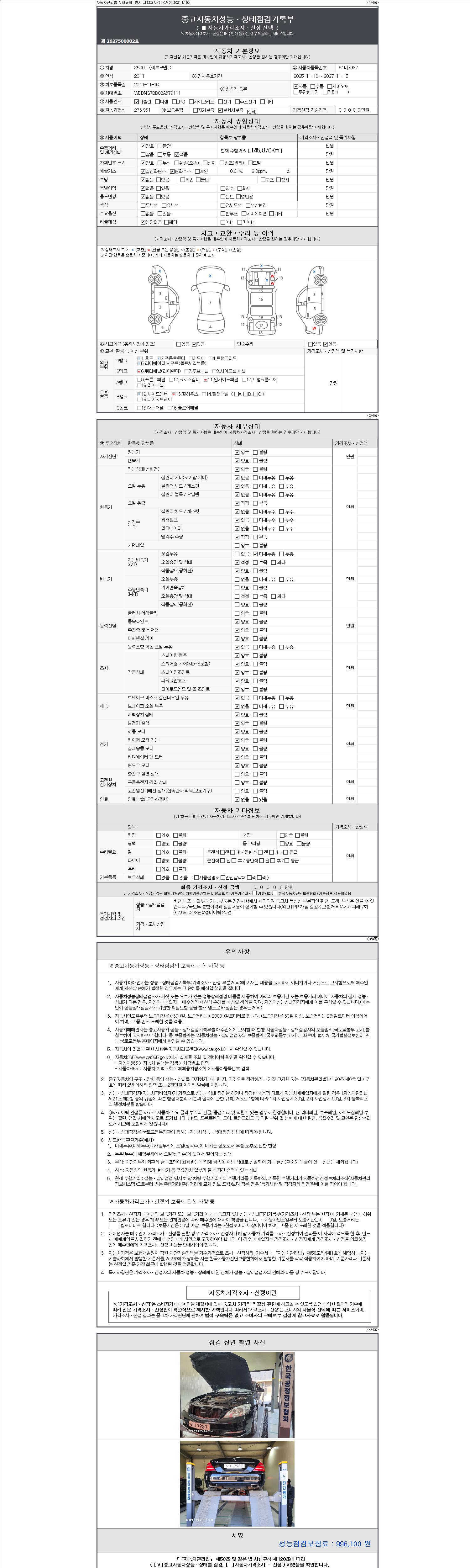 자동차관리법 시행규칙 제120조의 규정에 따라 별지 제 82호서식 《중고자동차 성능, 상태점검 기록부》를 발행한 성능, 상태점검자 및 매매자는 아래의 보증기간 또는 보증거리 이내의 중고자동차, 성능점검 기록부에 기재된 내용과 자동차의 실제 성능, 상태가 다른 경우 계약 또는 관계법령에 따라 매수인에 대하여 책임을 집니다.