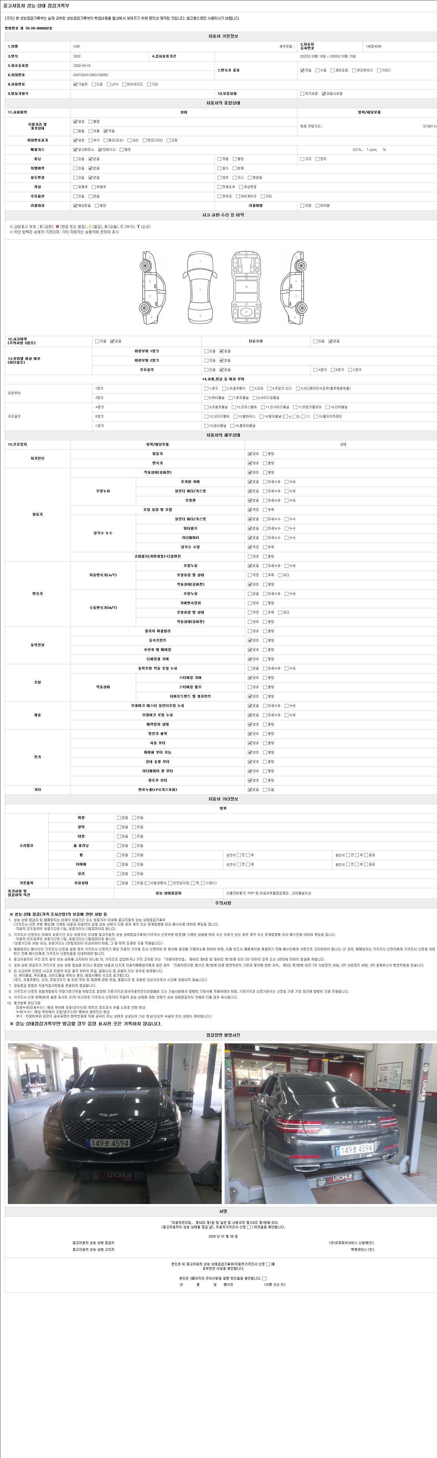 자동차관리법 시행규칙 제120조의 규정에 따라 별지 제 82호서식 《중고자동차 성능, 상태점검 기록부》를 발행한 성능, 상태점검자 및 매매자는 아래의 보증기간 또는 보증거리 이내의 중고자동차, 성능점검 기록부에 기재된 내용과 자동차의 실제 성능, 상태가 다른 경우 계약 또는 관계법령에 따라 매수인에 대하여 책임을 집니다.