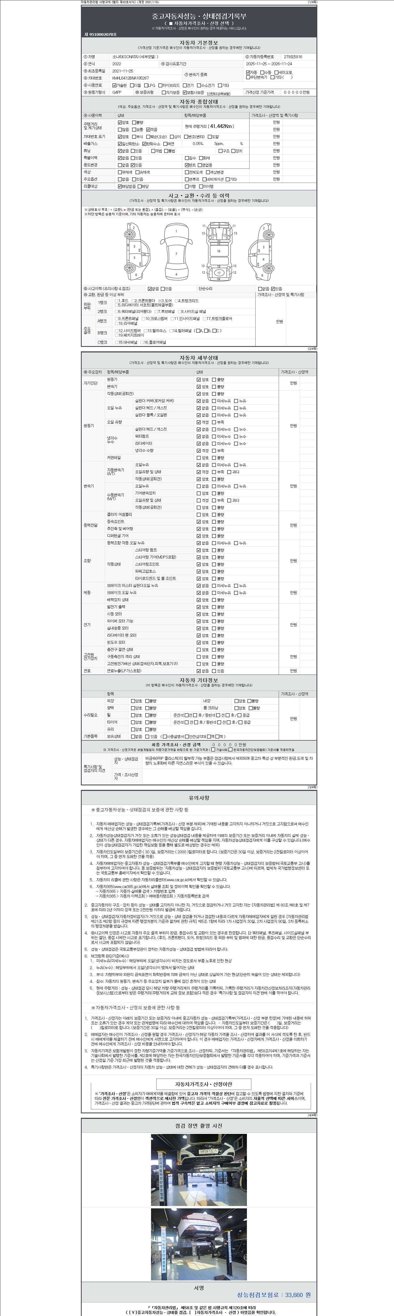 자동차관리법 시행규칙 제120조의 규정에 따라 별지 제 82호서식 《중고자동차 성능, 상태점검 기록부》를 발행한 성능, 상태점검자 및 매매자는 아래의 보증기간 또는 보증거리 이내의 중고자동차, 성능점검 기록부에 기재된 내용과 자동차의 실제 성능, 상태가 다른 경우 계약 또는 관계법령에 따라 매수인에 대하여 책임을 집니다.