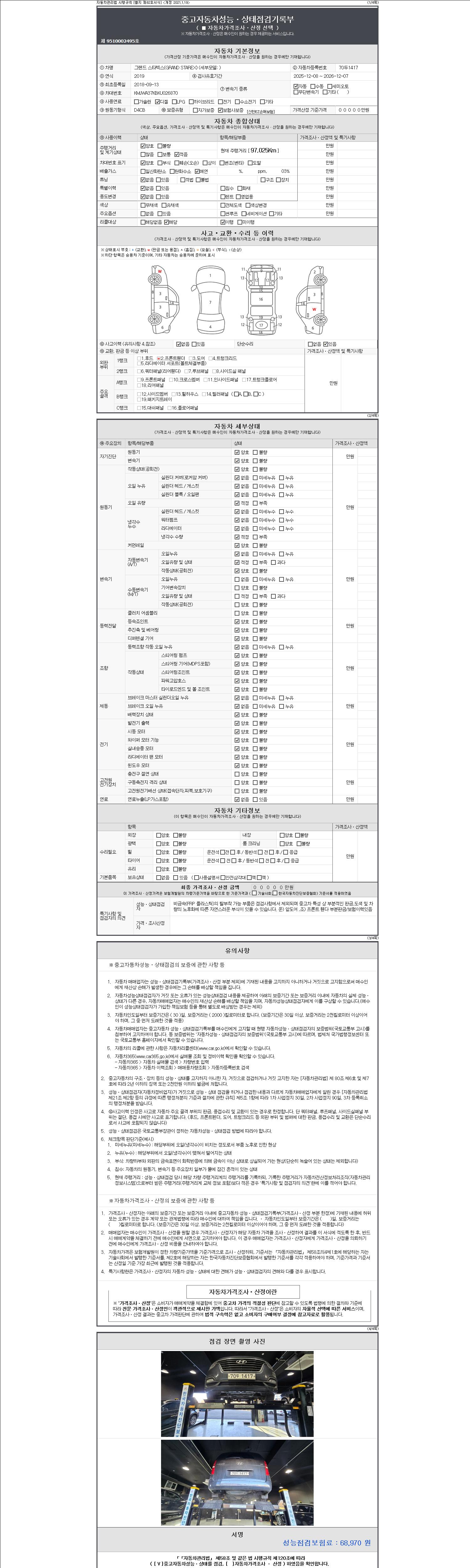 자동차관리법 시행규칙 제120조의 규정에 따라 별지 제 82호서식 《중고자동차 성능, 상태점검 기록부》를 발행한 성능, 상태점검자 및 매매자는 아래의 보증기간 또는 보증거리 이내의 중고자동차, 성능점검 기록부에 기재된 내용과 자동차의 실제 성능, 상태가 다른 경우 계약 또는 관계법령에 따라 매수인에 대하여 책임을 집니다.